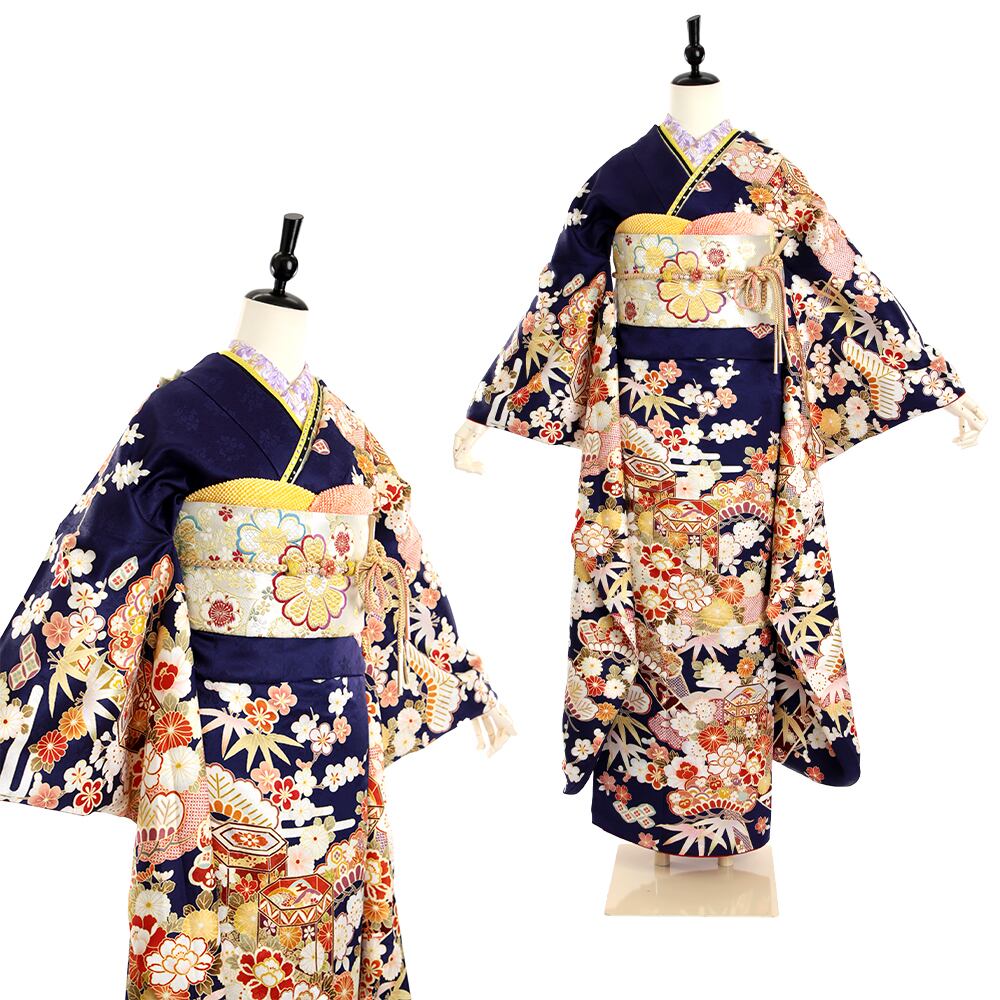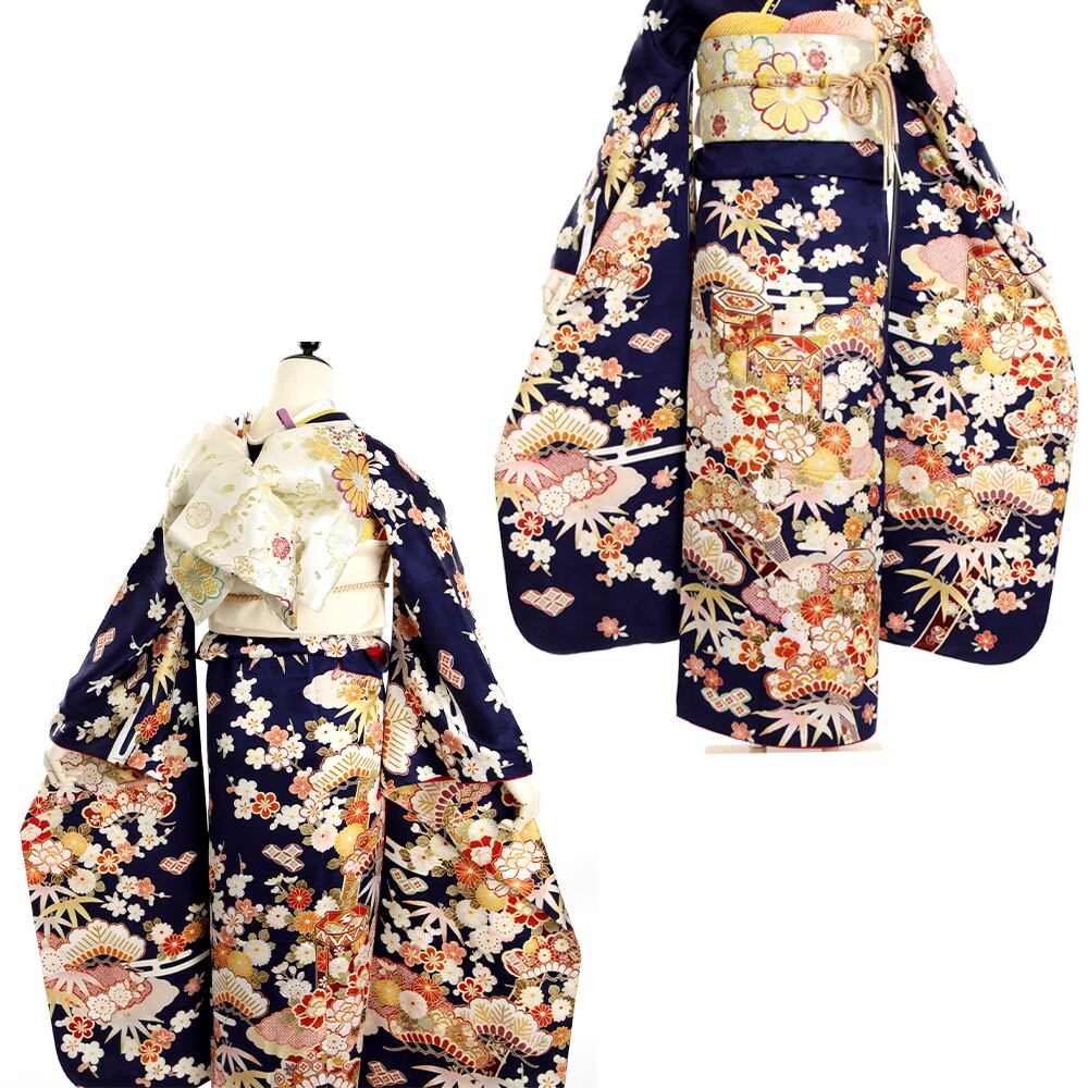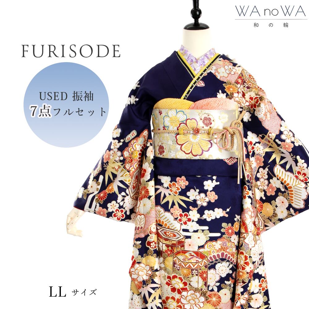振袖 振袖セット USED振袖 紺 古典柄 松竹梅 貝桶 7点フルセット レディース LLサイズ WA-F-16