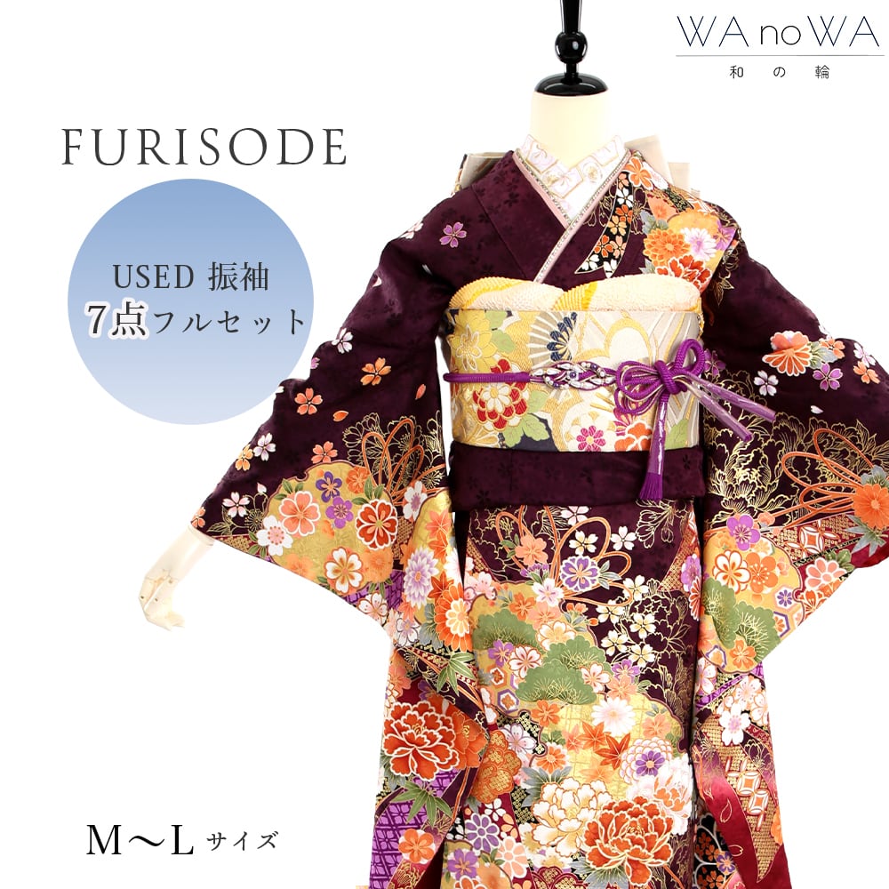 振袖 振袖セット USED振袖 紫 古典柄 牡丹 松竹梅 7点フルセット レディース M〜Lサイズ WA-F-41