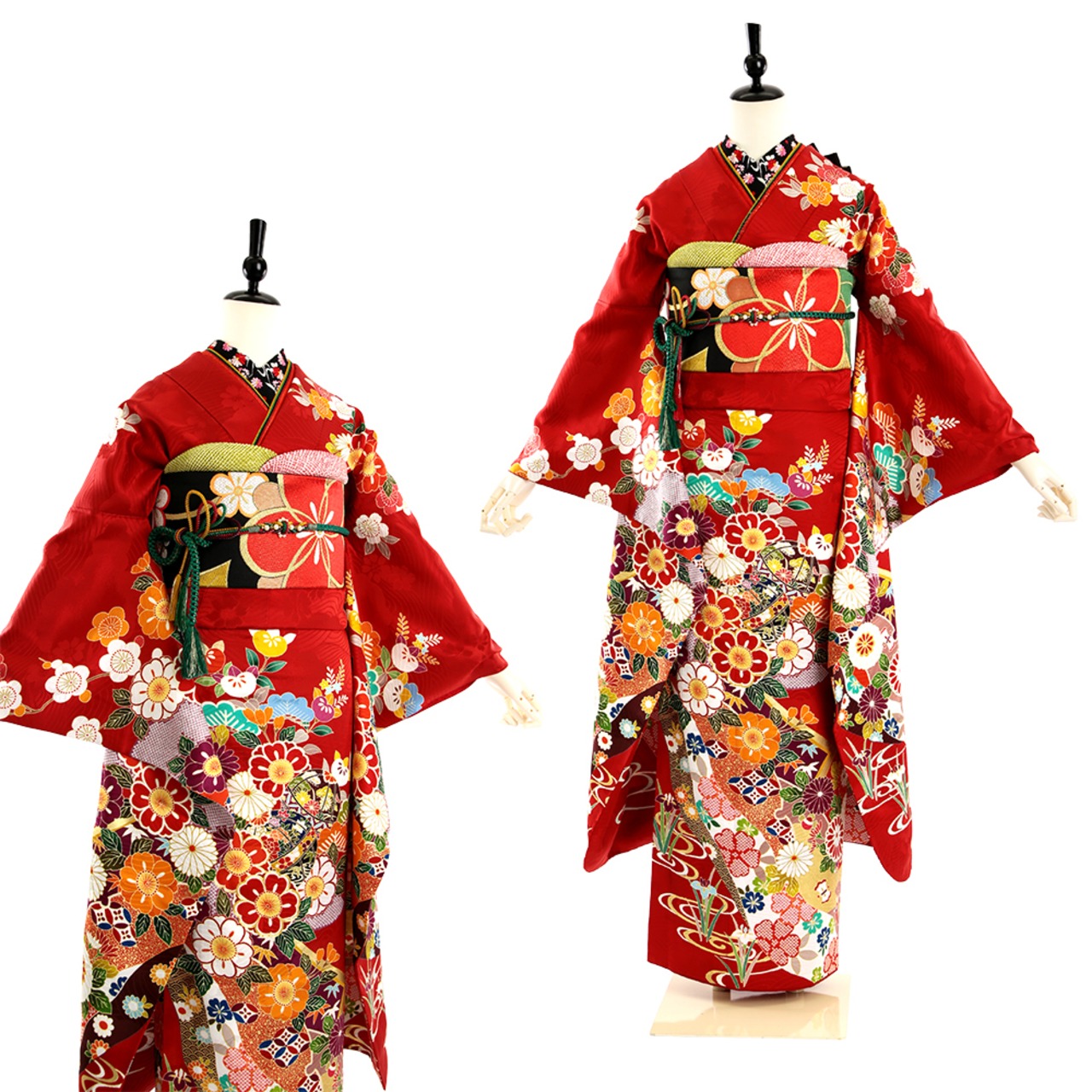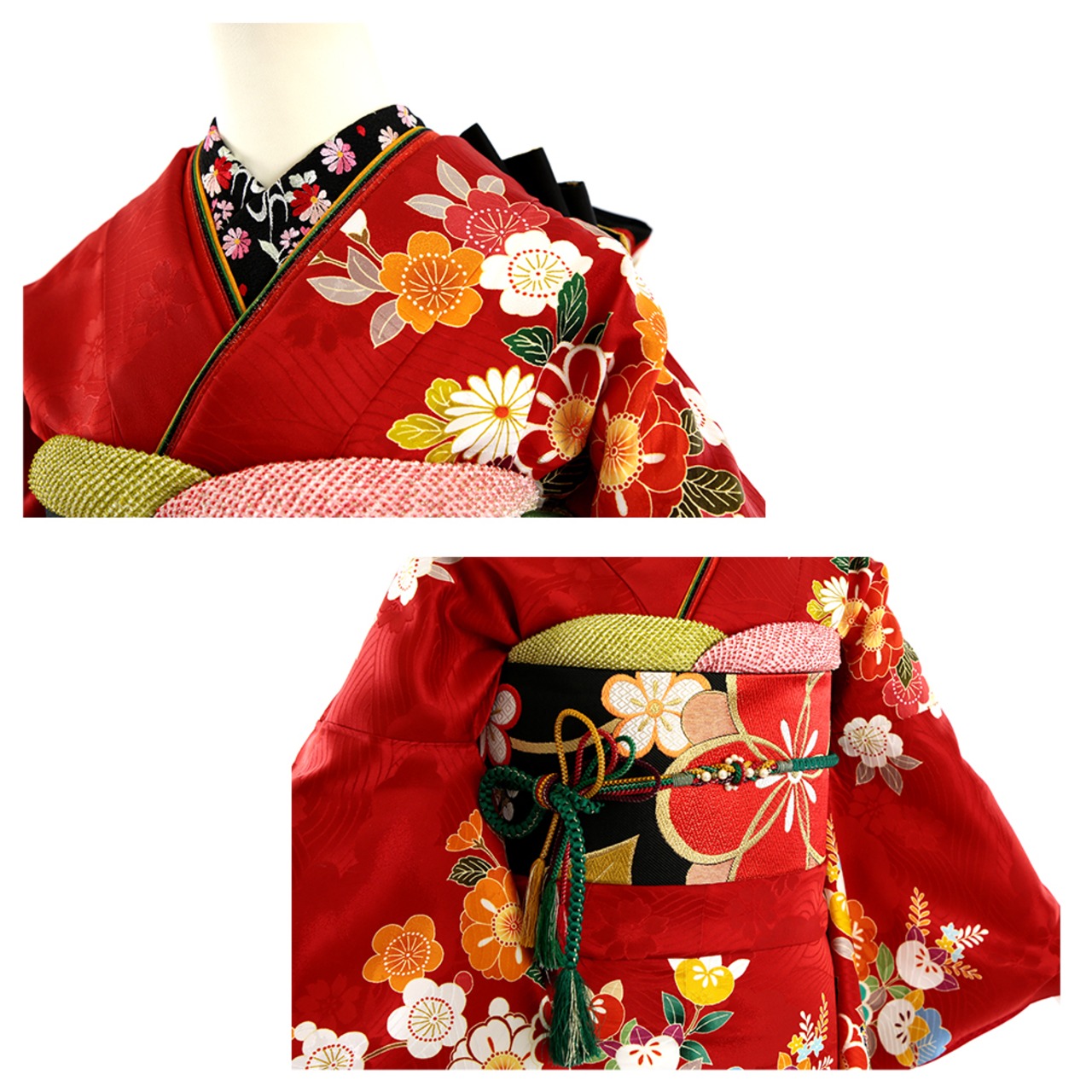 赤地に華やかな柄が印象的な古典振袖です。袋帯や半衿は黒色で大人っぽく、まとまりのあるコーディネートに仕上げました。