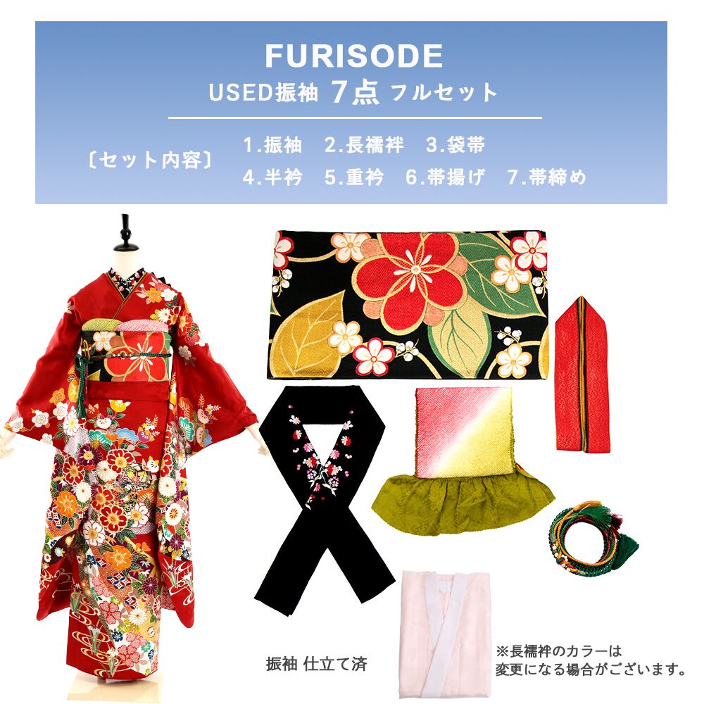 振袖 振袖セット USED振袖 赤 古典柄 鞠 熨斗 7点フルセット レディース Lサイズ WA-F-59