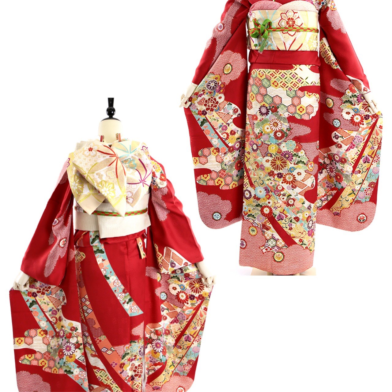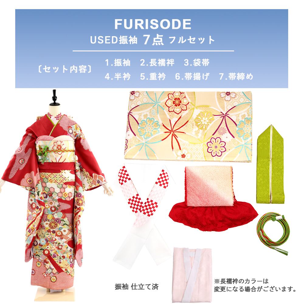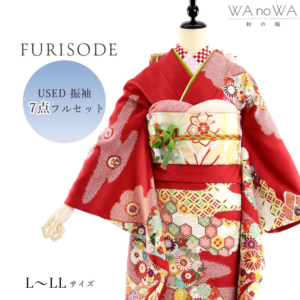振袖 振袖セット USED振袖 赤 古典柄 鹿の子 熨斗 7点フルセット レディース L〜LLサイズ WA-F-78