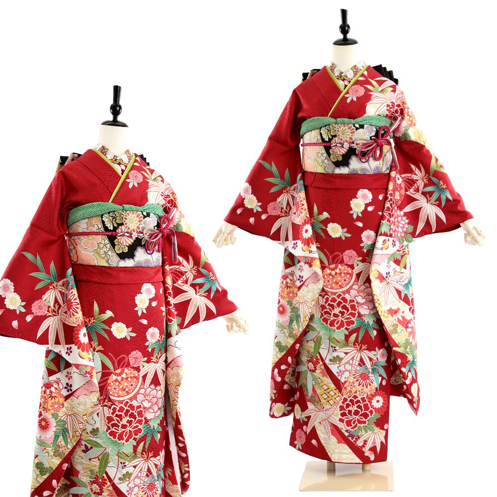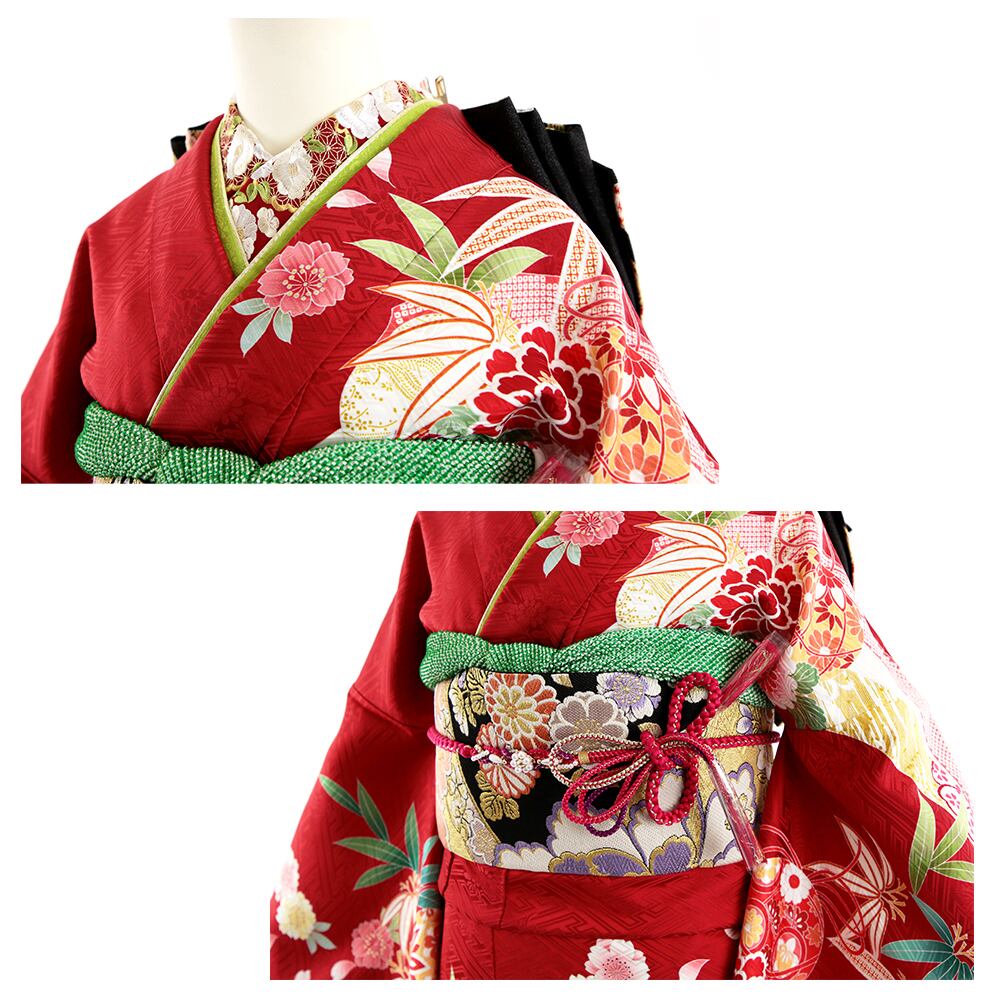 赤地に熨斗や鞠が印象的な古典振袖です。黒の袋帯で大人っぽく、赤や緑色の小物で統一感のあるコーディネートに仕上げました。