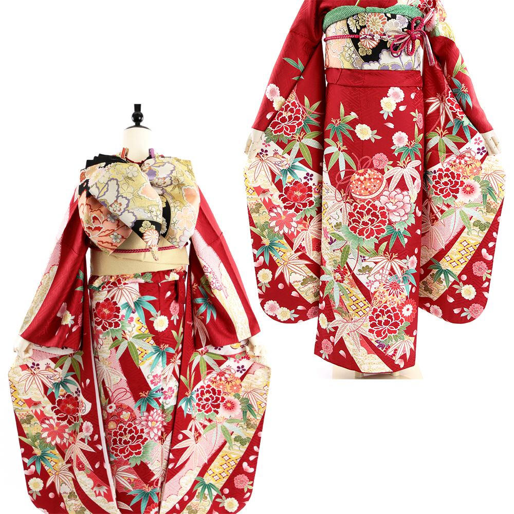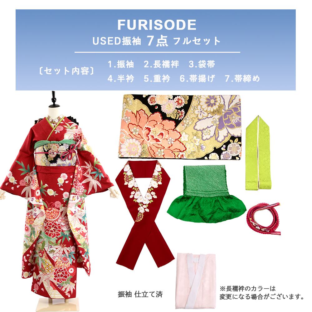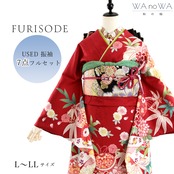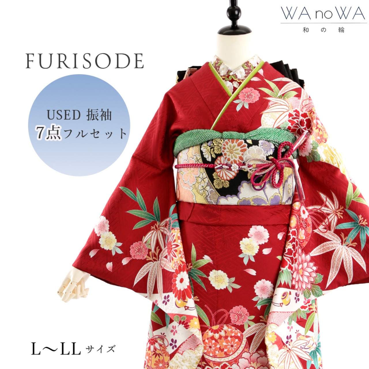 振袖 振袖セット USED振袖 赤 古典柄 熨斗 鞠 7点フルセット レディース LLサイズ WA-F-85
