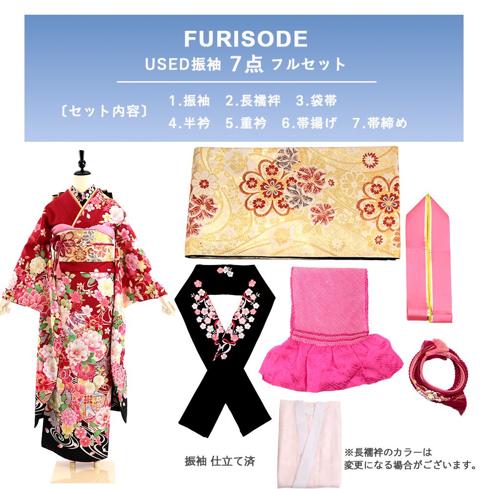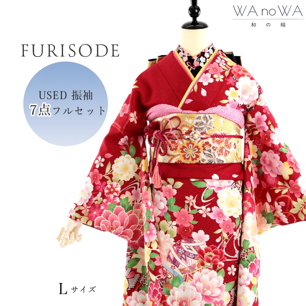 振袖 振袖セット USED振袖 赤 古典柄 流水 鞠 7点フルセット レディース Lサイズ WA-F-86