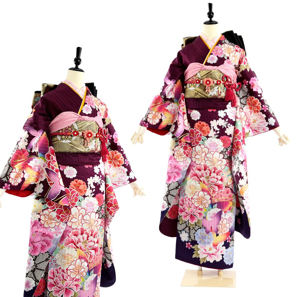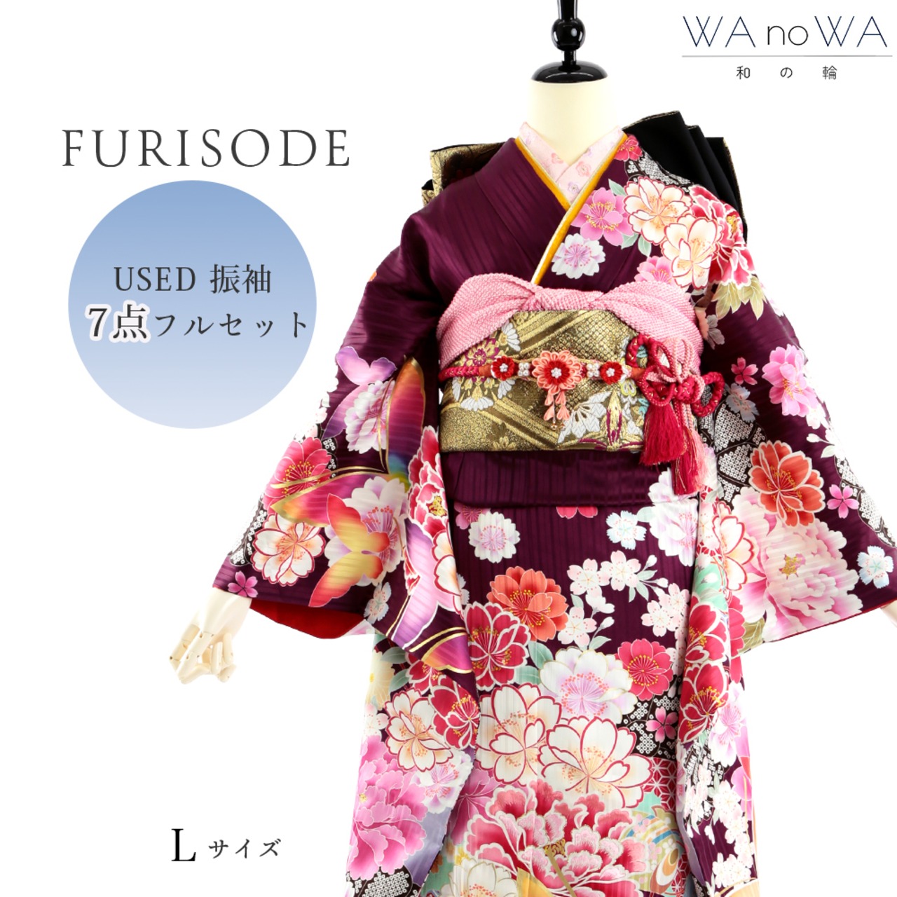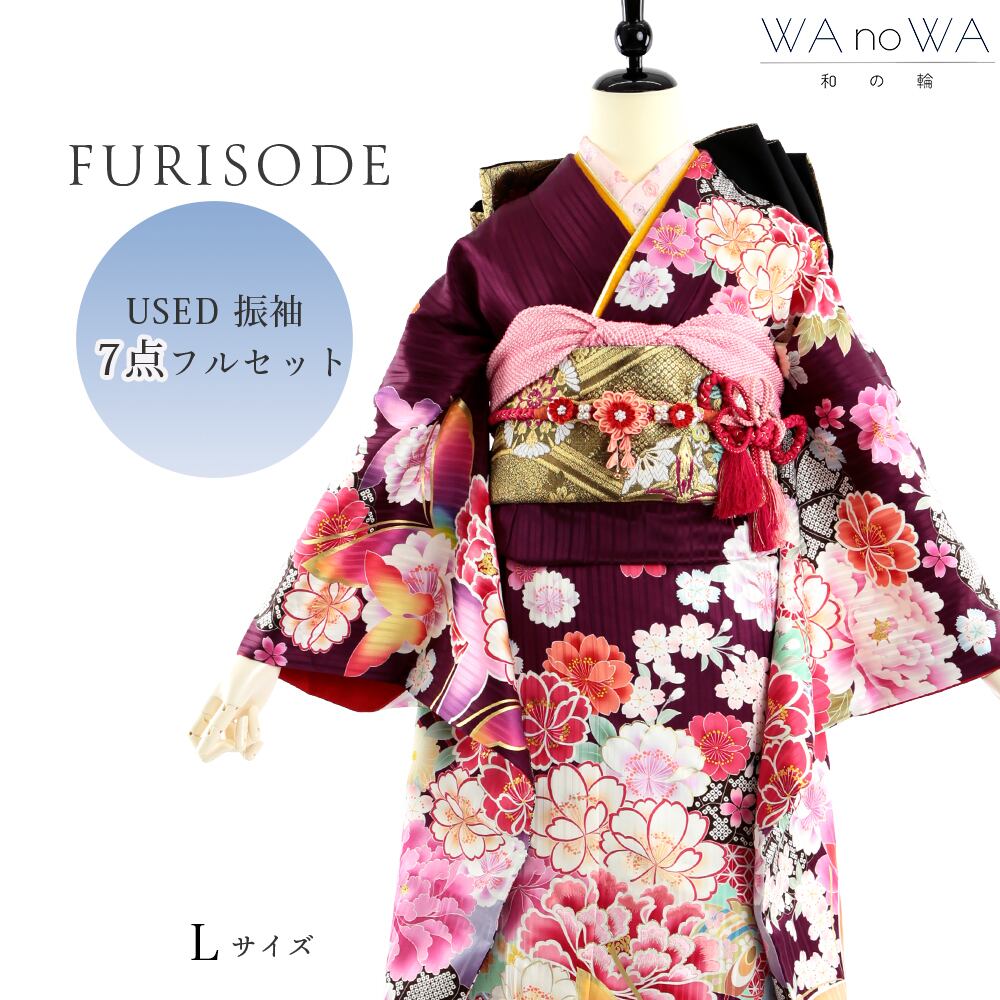 振袖 振袖セット USED振袖 紫 古典柄 牡丹 蝶 7点フルセット レディース Lサイズ WA-F-97