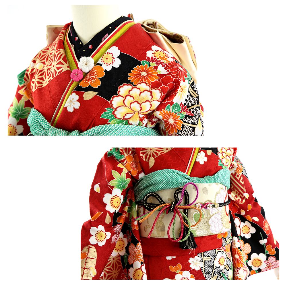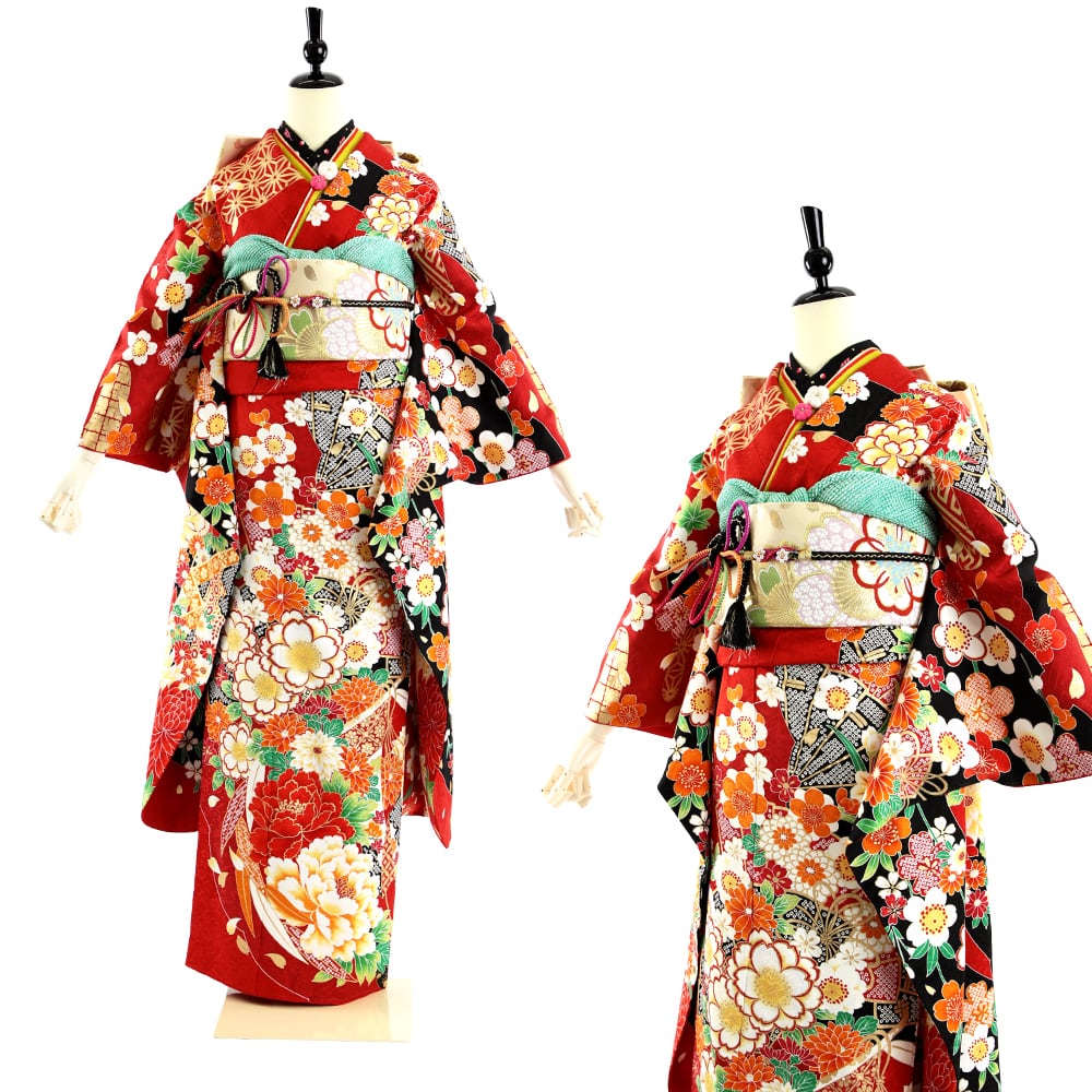 赤地に牡丹や菊が印象的な古典振袖です。半衿と帯締めは黒で統一感があり、水色の帯揚げが差し色でポイントとなっております。