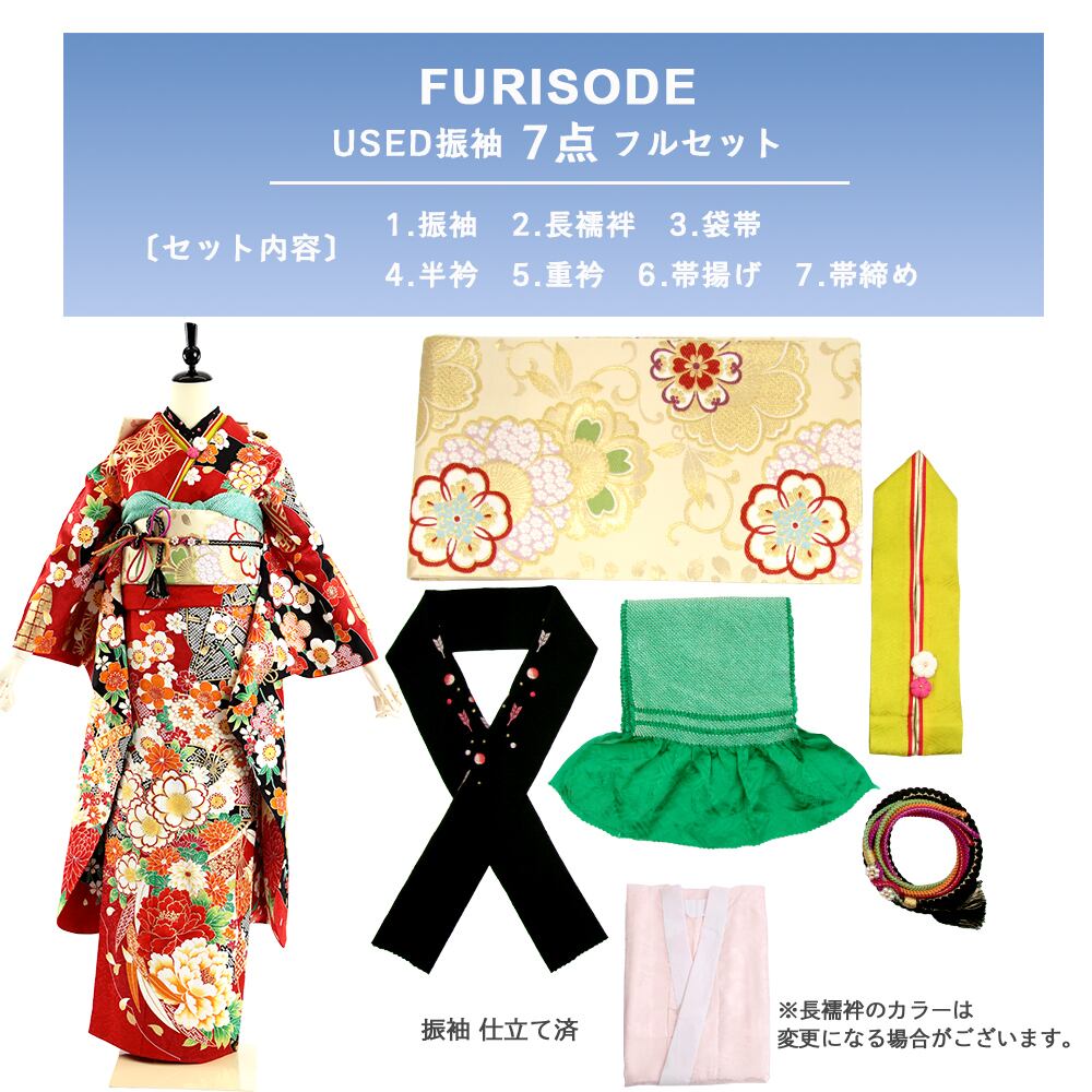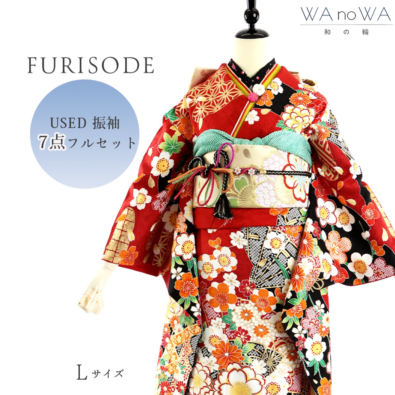 振袖 振袖セット USED振袖 赤 古典柄 牡丹 菊 7点フルセット レディース Lサイズ WA-F-103