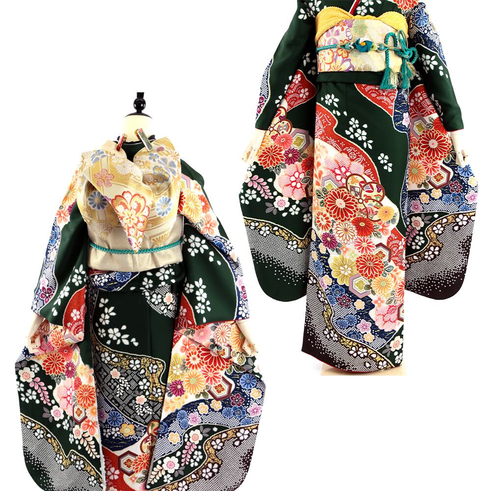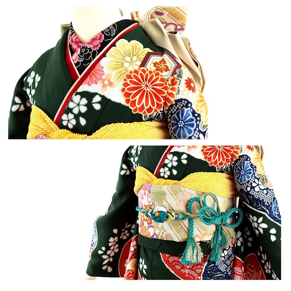 深い緑地に菊や鹿の子が印象的な古典振袖です。黒の半衿で大人っぽく、明るい色合いの小物で華やか雰囲気のなコーディネートに仕上げました。