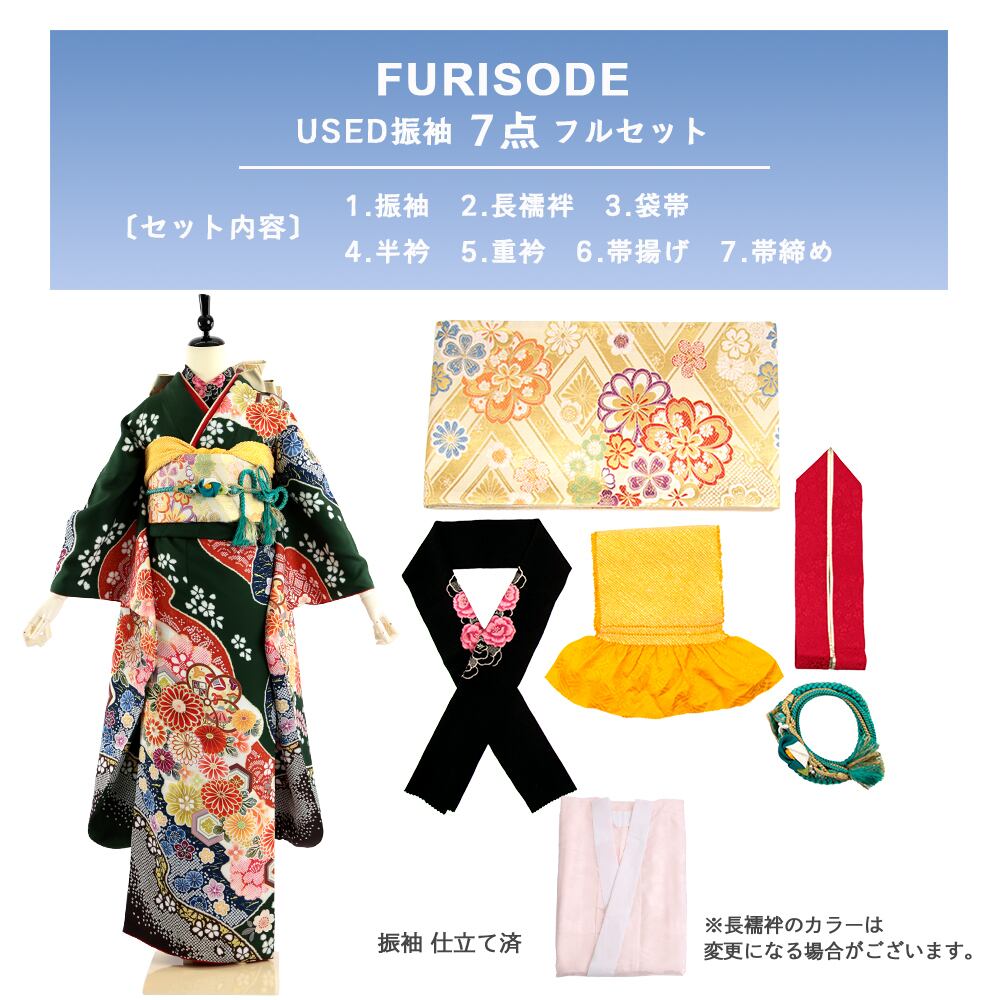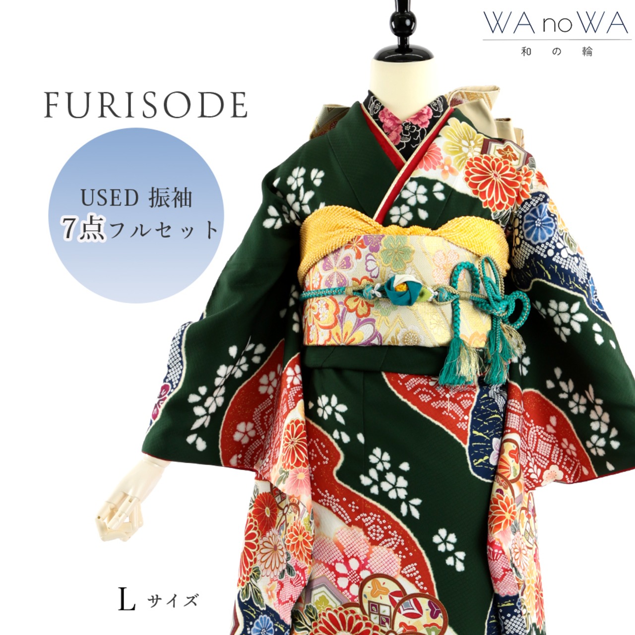振袖 振袖セット USED振袖 緑 古典柄 鹿の子 菊 7点フルセット レディース Lサイズ WA-F-105