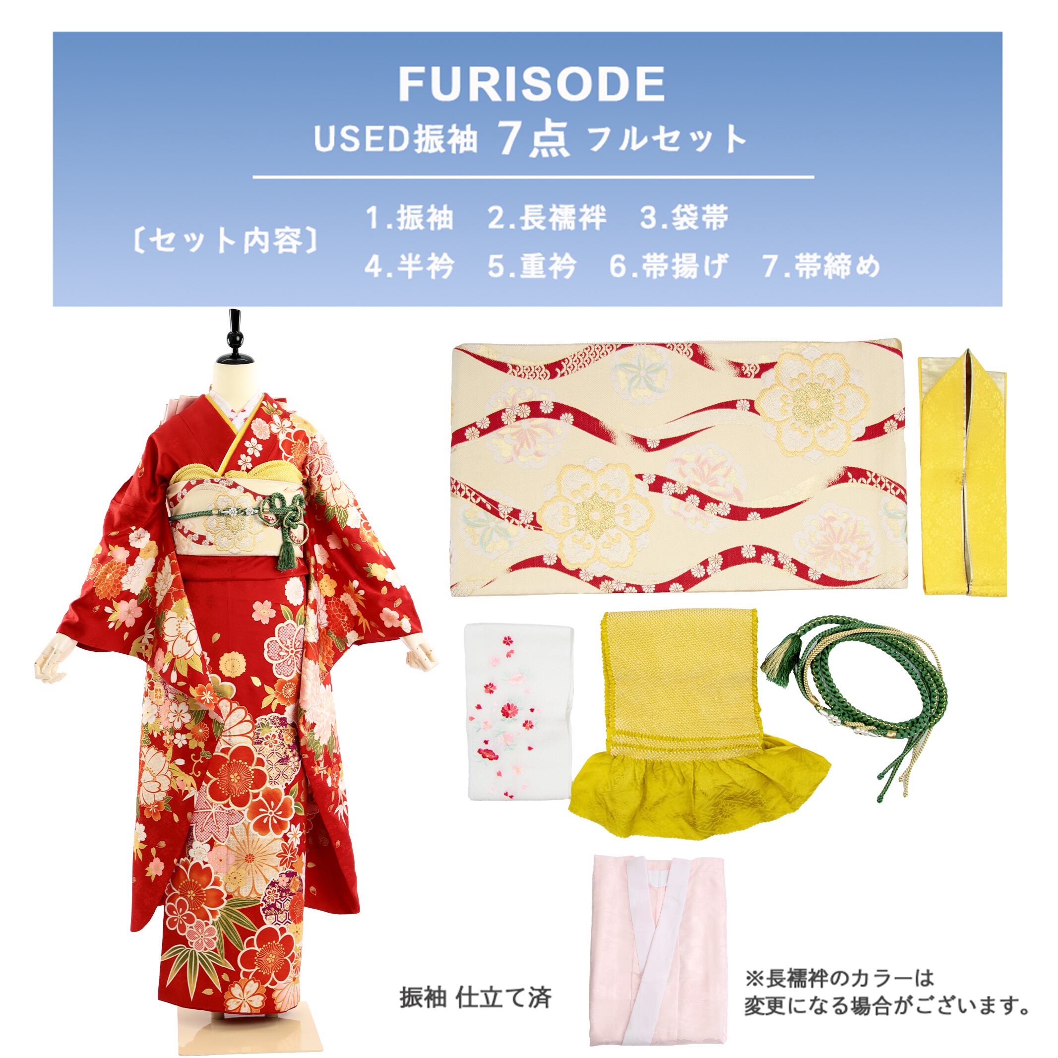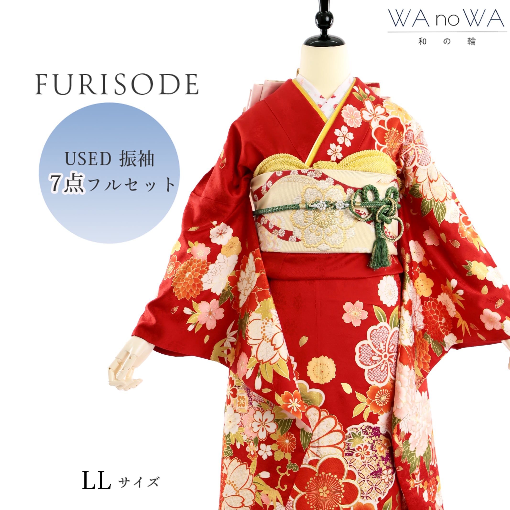 振袖 振袖セット USED振袖 赤 古典柄 雪輪 梅 7点フルセット レディース LLサイズ WA-F-113