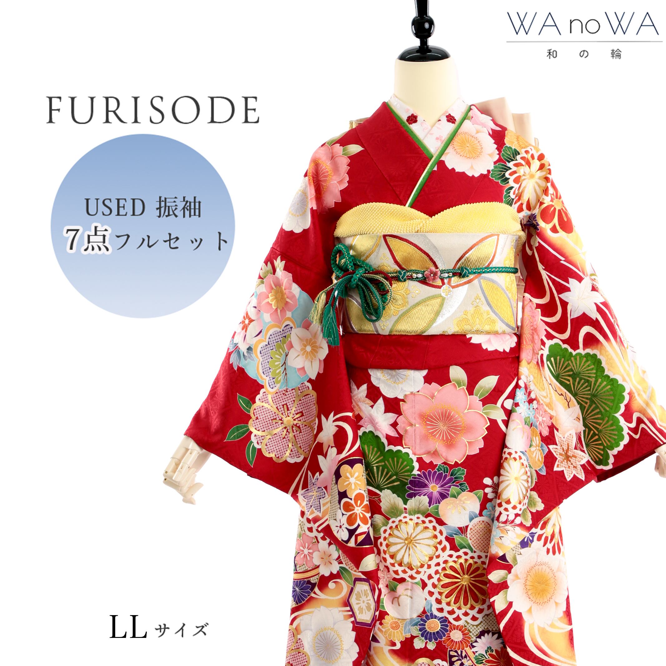 振袖 振袖セット USED振袖 赤 古典柄 流水 菊 7点フルセット レディース LLサイズ WA-F-117