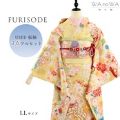 振袖 振袖セット USED振袖 クリーム 黄 新古典柄 牡丹 7点フルセット レディース LLサイズ WA-F-119