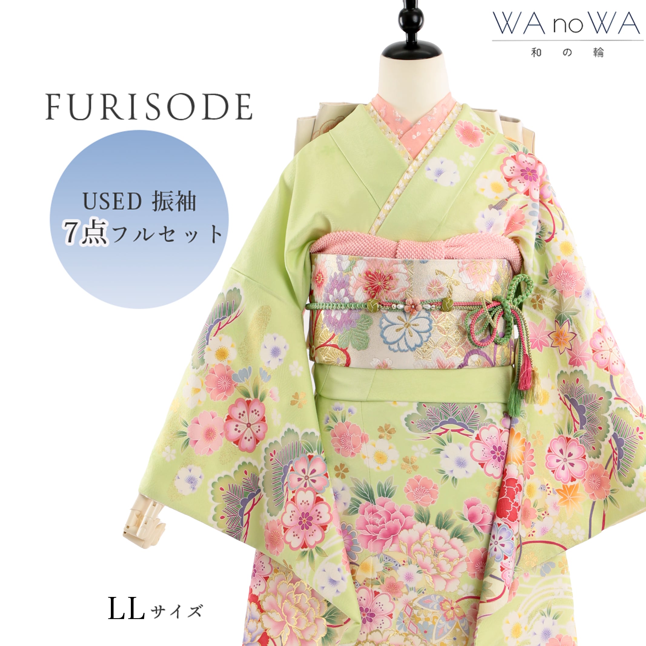 振袖 振袖セット USED振袖 薄緑 古典柄 牡丹 鞠 7点フルセット レディース LLサイズ WA-F-122