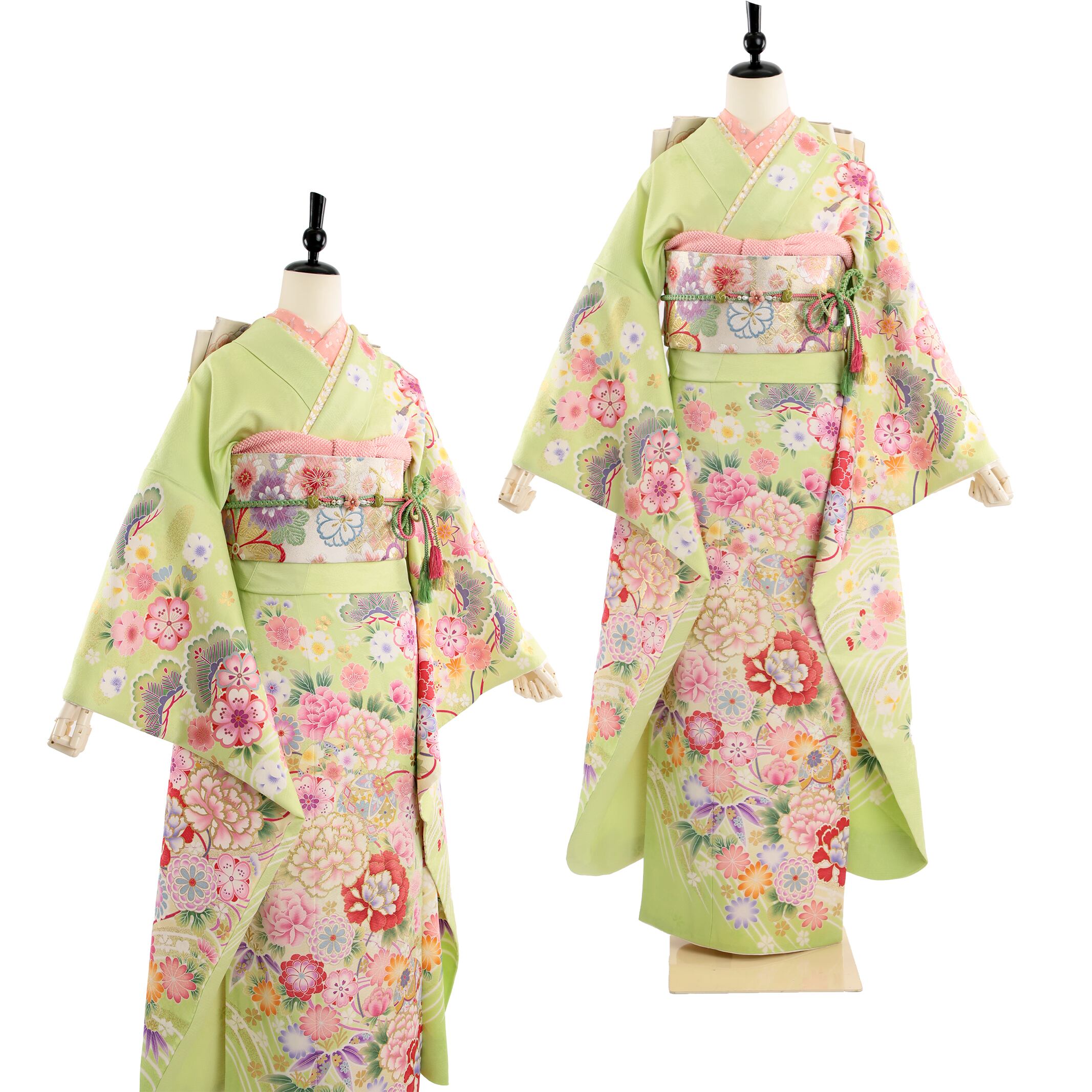 優しい緑地に淡いカラーの柄が魅力的で可憐な印象を与える古典振袖です。