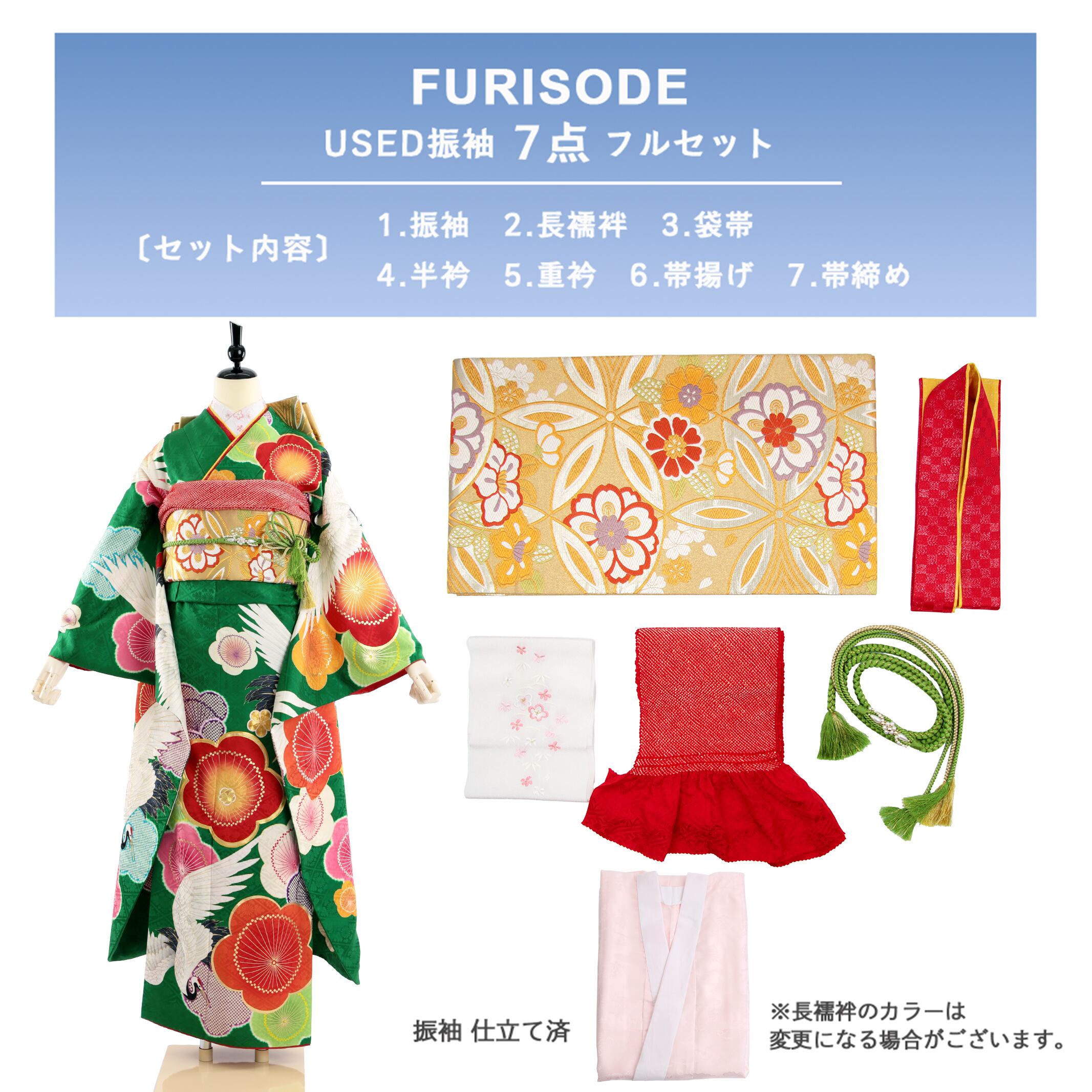 振袖 振袖セット USED振袖 緑 レトロ モダン 鶴 梅 7点フルセット レディース LLサイズ WA-F-123