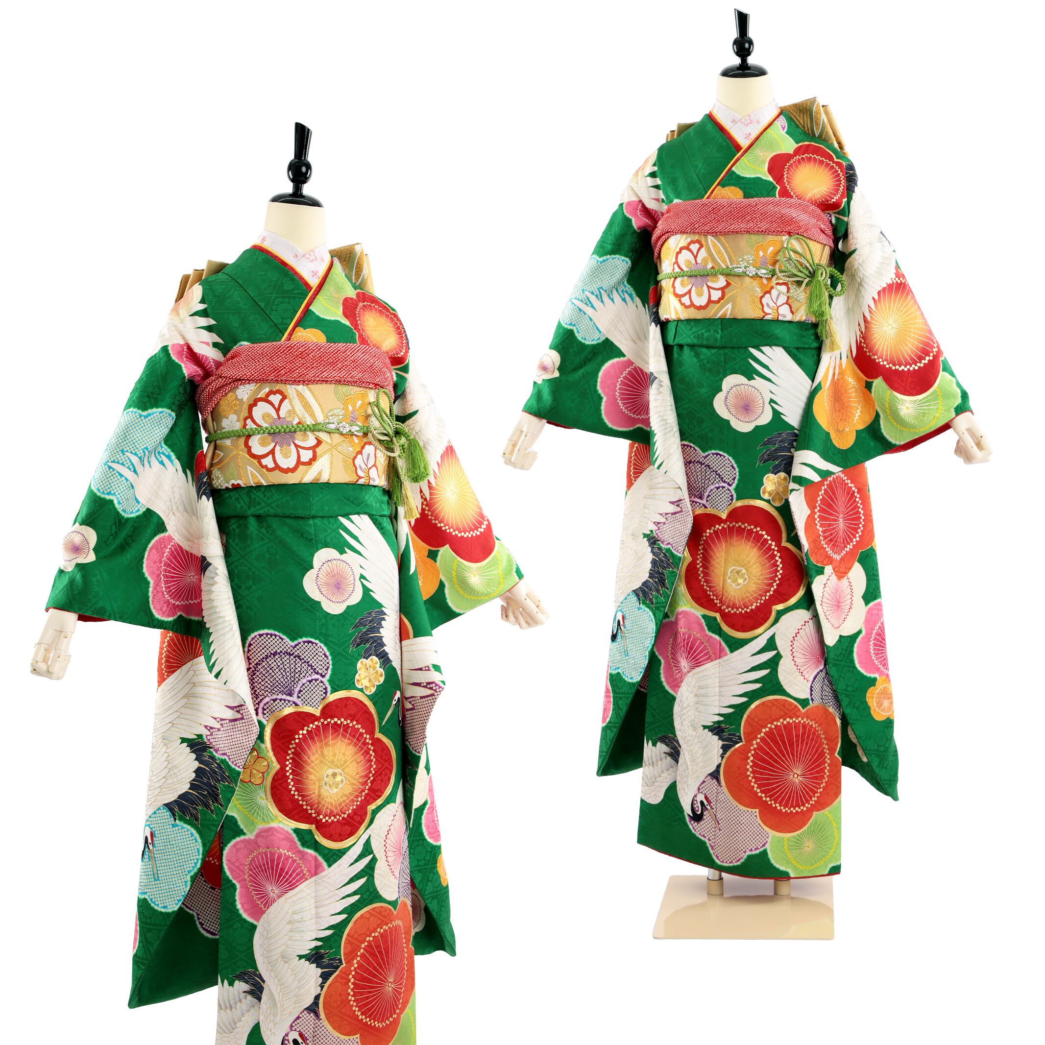 緑地に大柄の梅や鶴が印象的な古典振袖です。