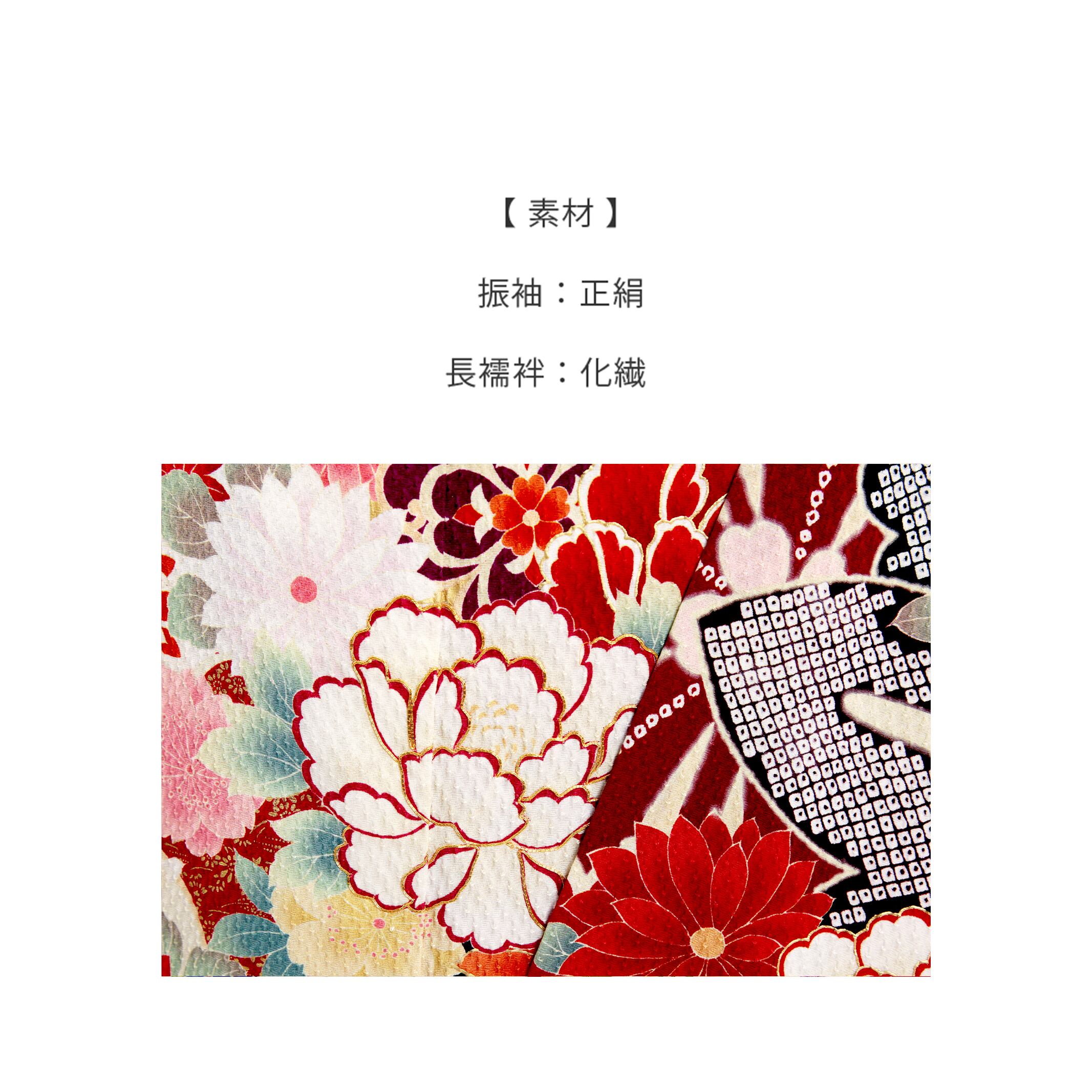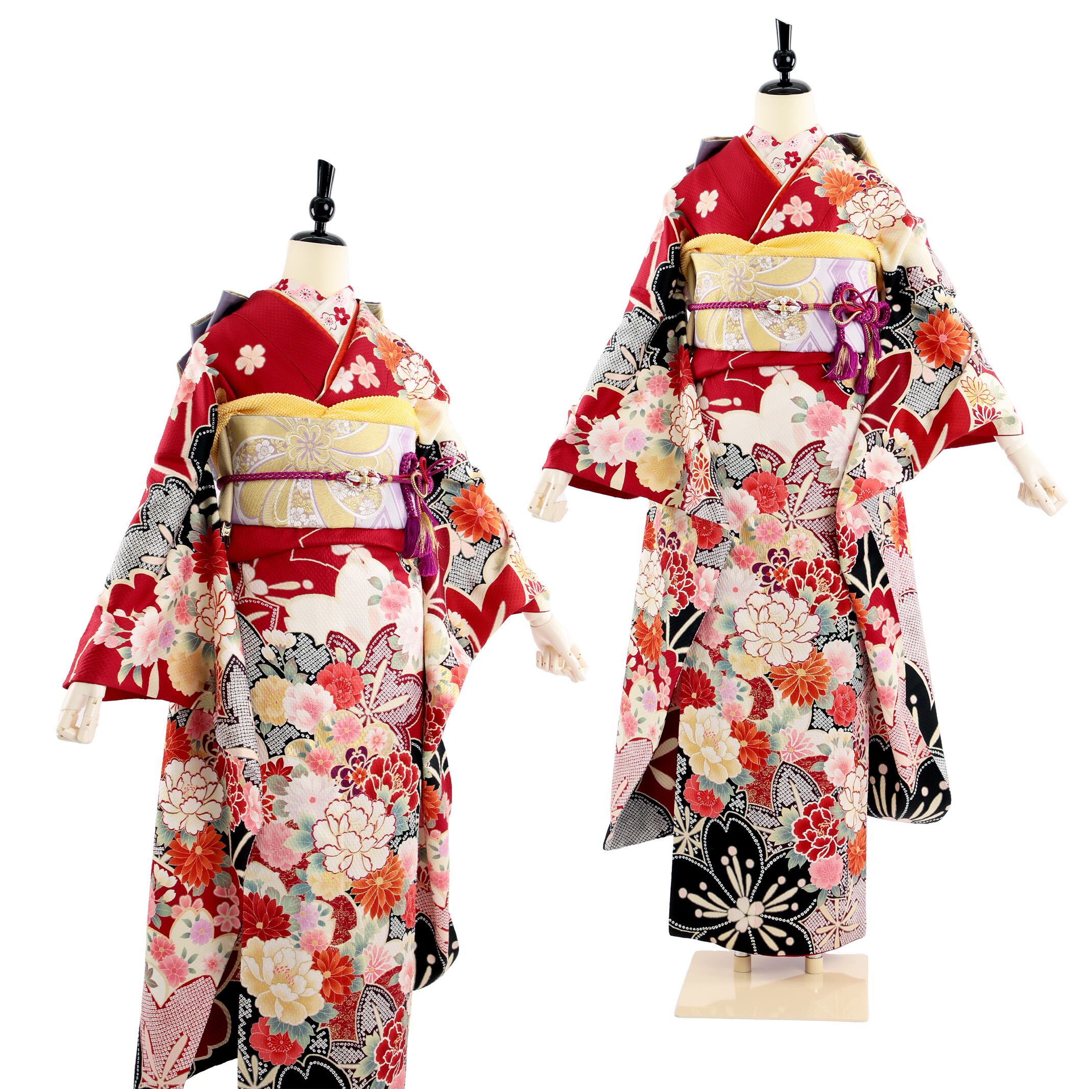 赤地に敷き詰められた牡丹や鹿の子が印象的な古典振袖です。