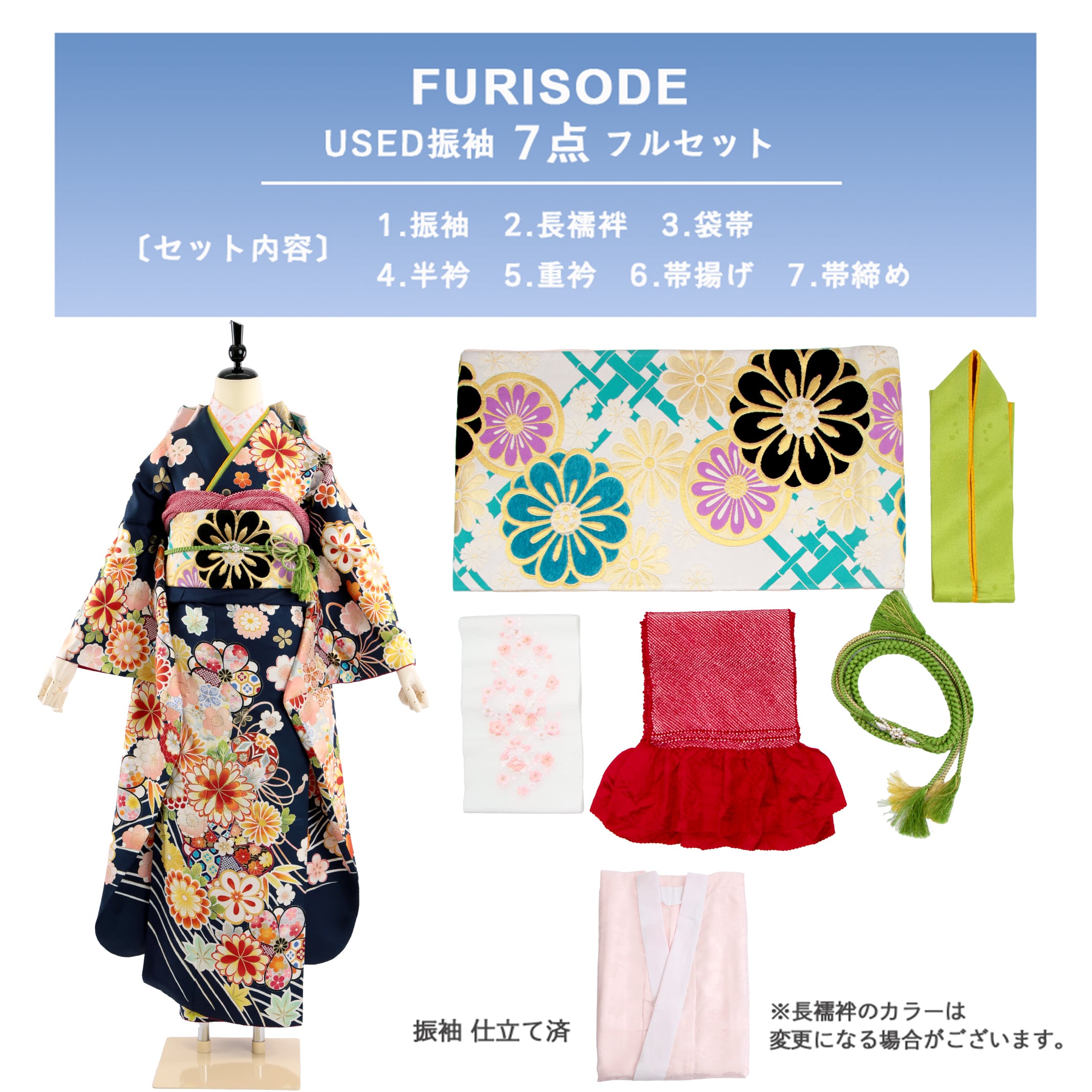 振袖 振袖セット USED振袖 紺 古典柄 鞠 7点フルセット レディース LLサイズ WA-F-129