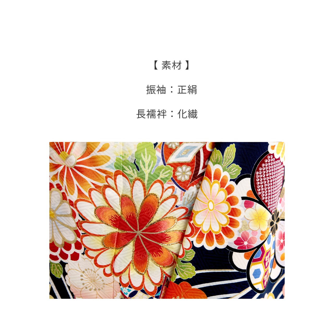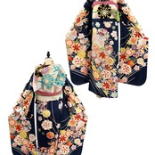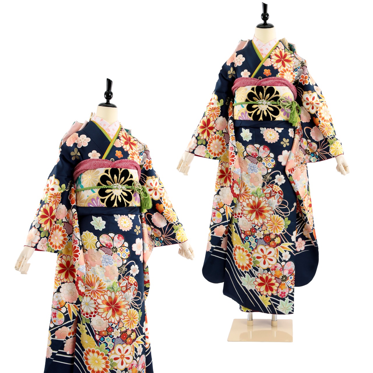 深い紺色を基調に、菊や鞠が印象的に描かれた古典的な振袖です。