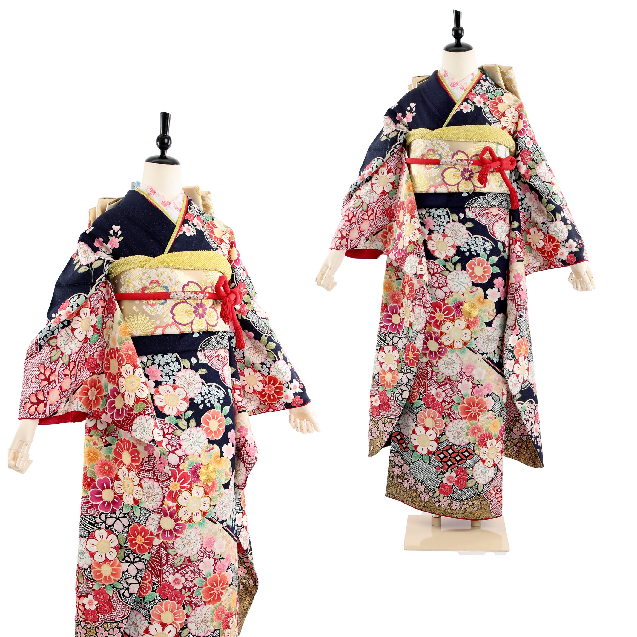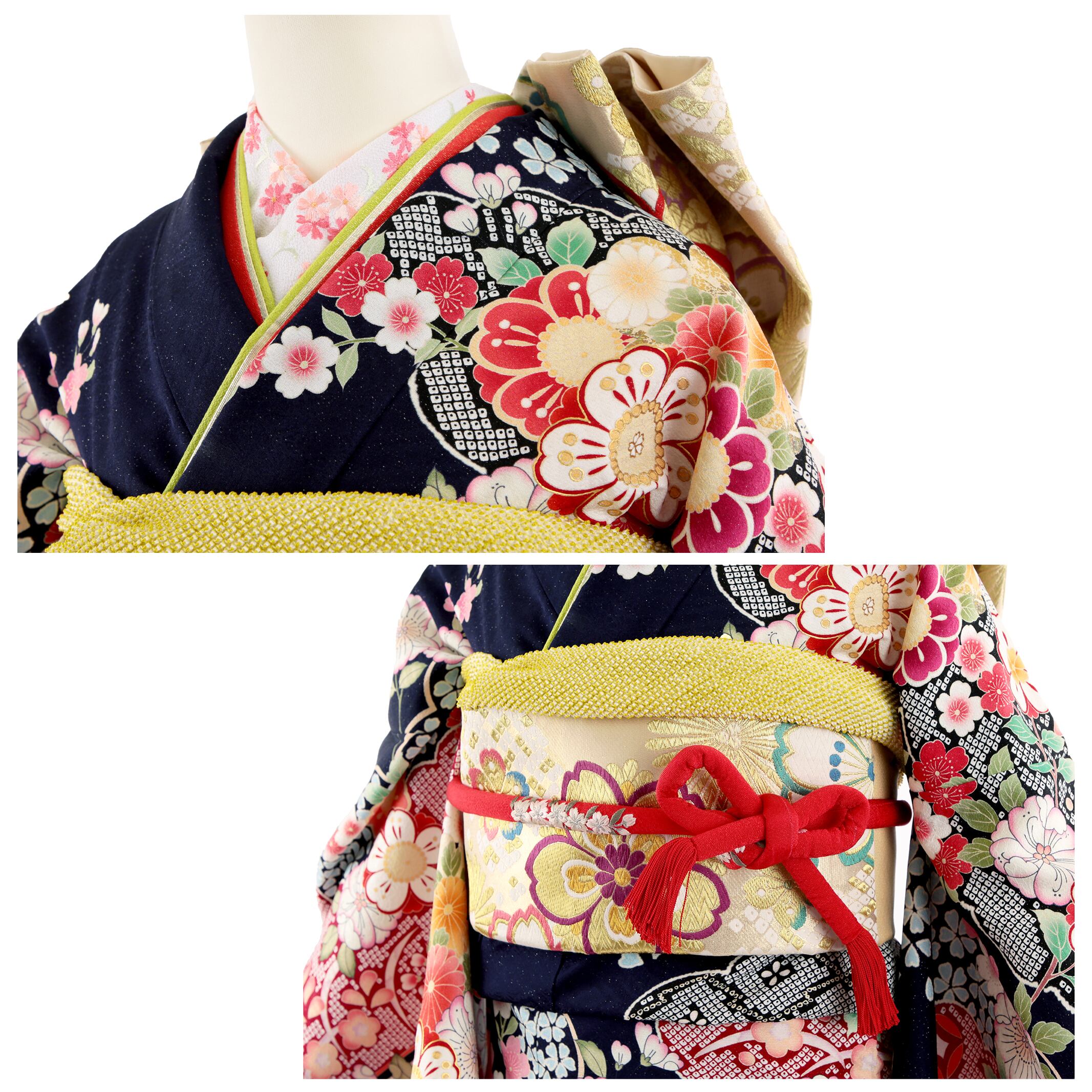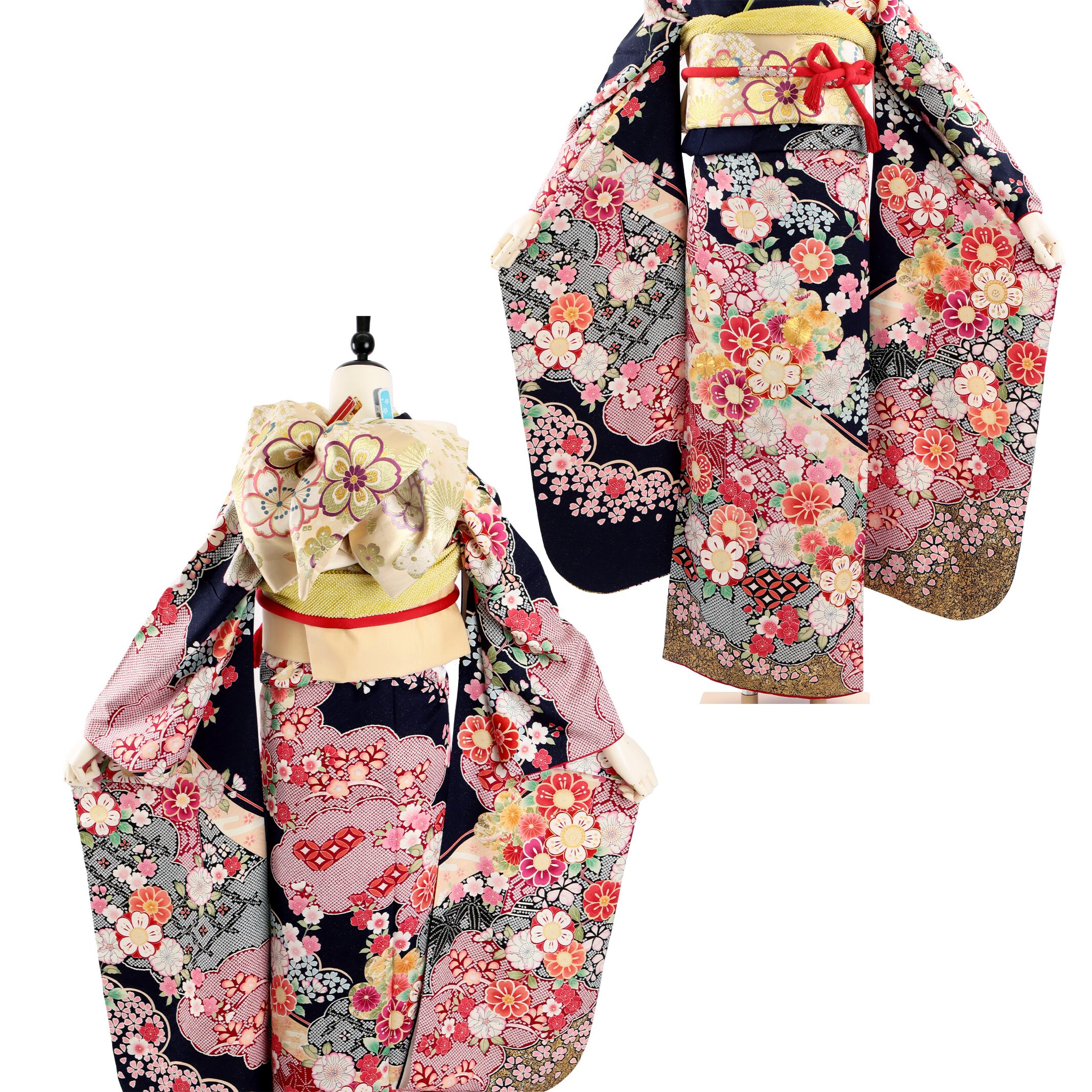ラメ感ある紺地に鮮やかな花柄が印象的な古典振袖です。