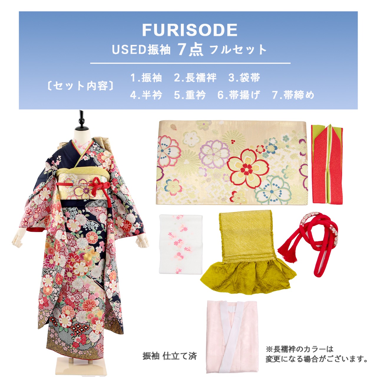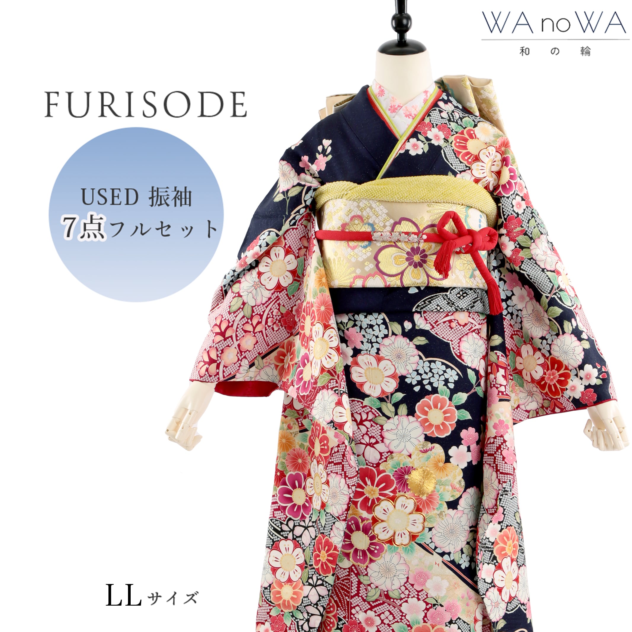 振袖 振袖セット USED振袖 紺 古典柄 桜 鹿の子 7点フルセット レディース LLサイズ WA-F-132