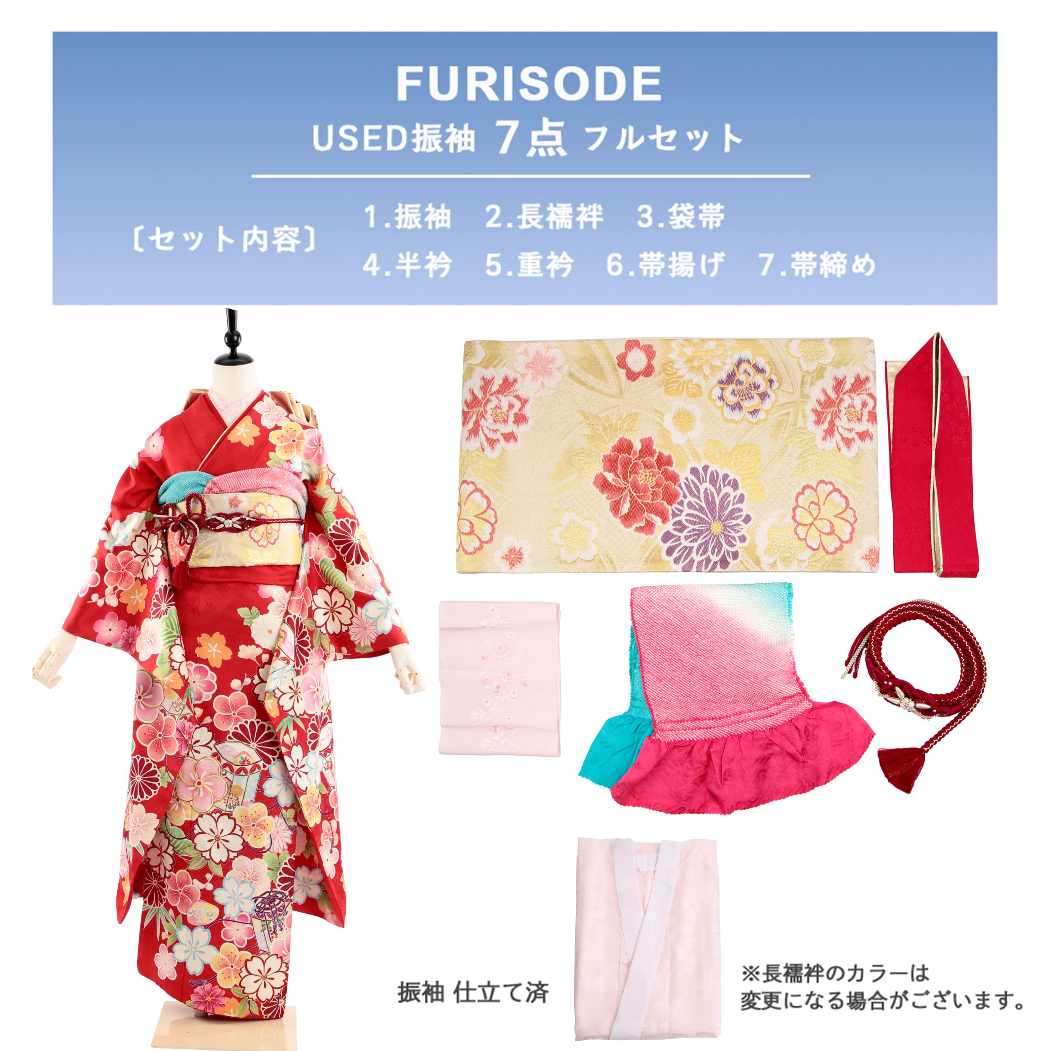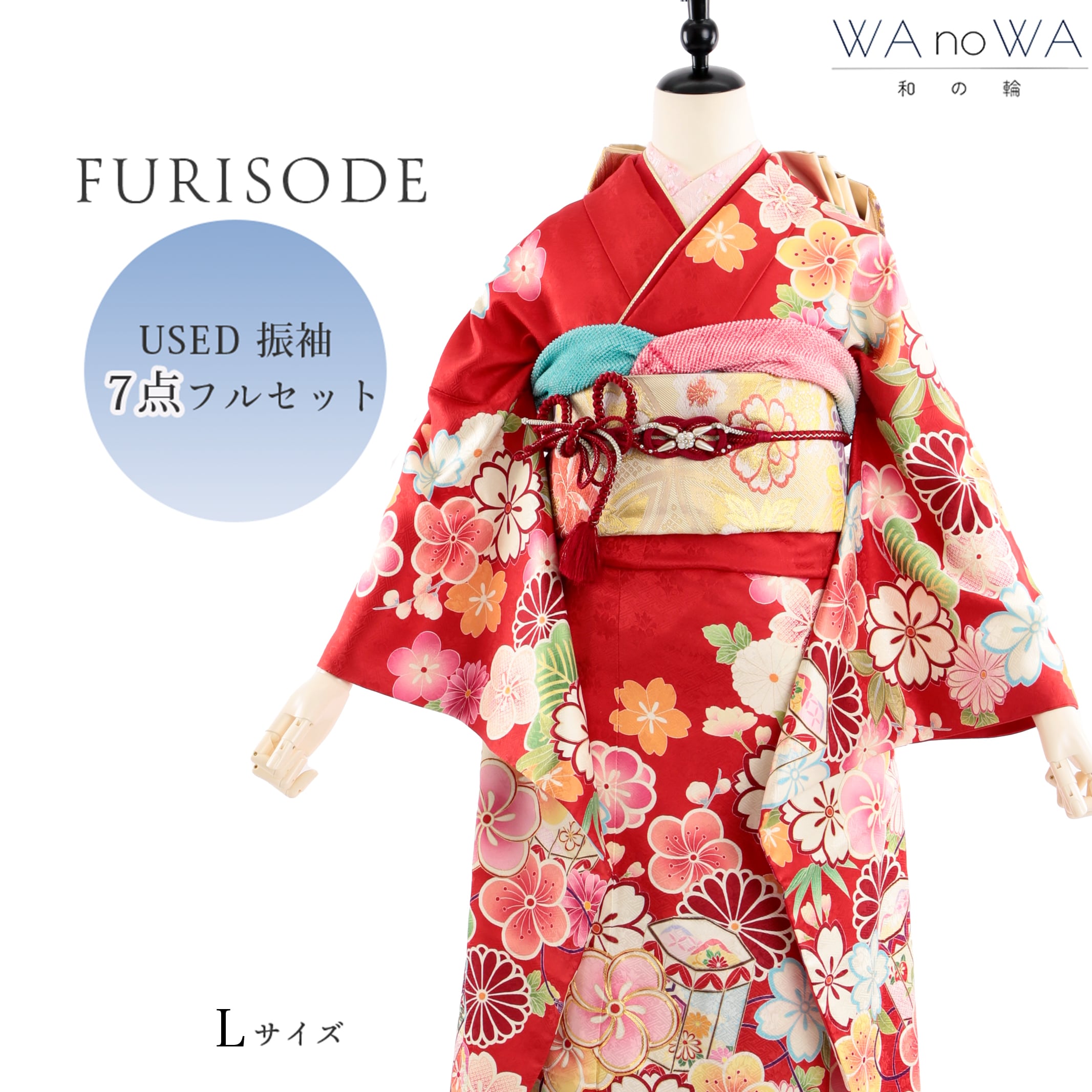 振袖 振袖セット USED振袖 赤 古典柄 梅 貝桶 7点フルセット レディース Lサイズ WA-F-133