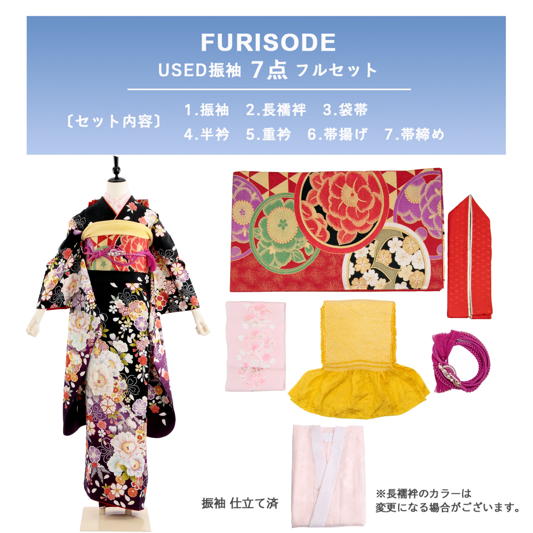 振袖 振袖セット USED振袖 黒 古典柄 モダン 桜 7点フルセット レディース M〜Lサイズ WA-F-150