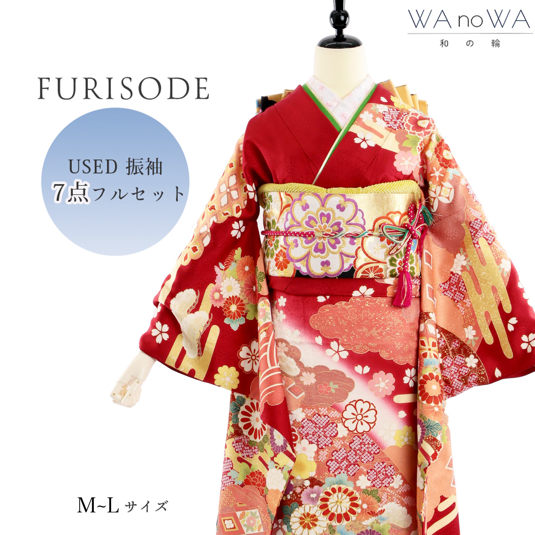 振袖 振袖セット USED振袖 赤 新古典柄 菊 金駒刺繍 7点フルセット レディース M〜Lサイズ WA-F-152