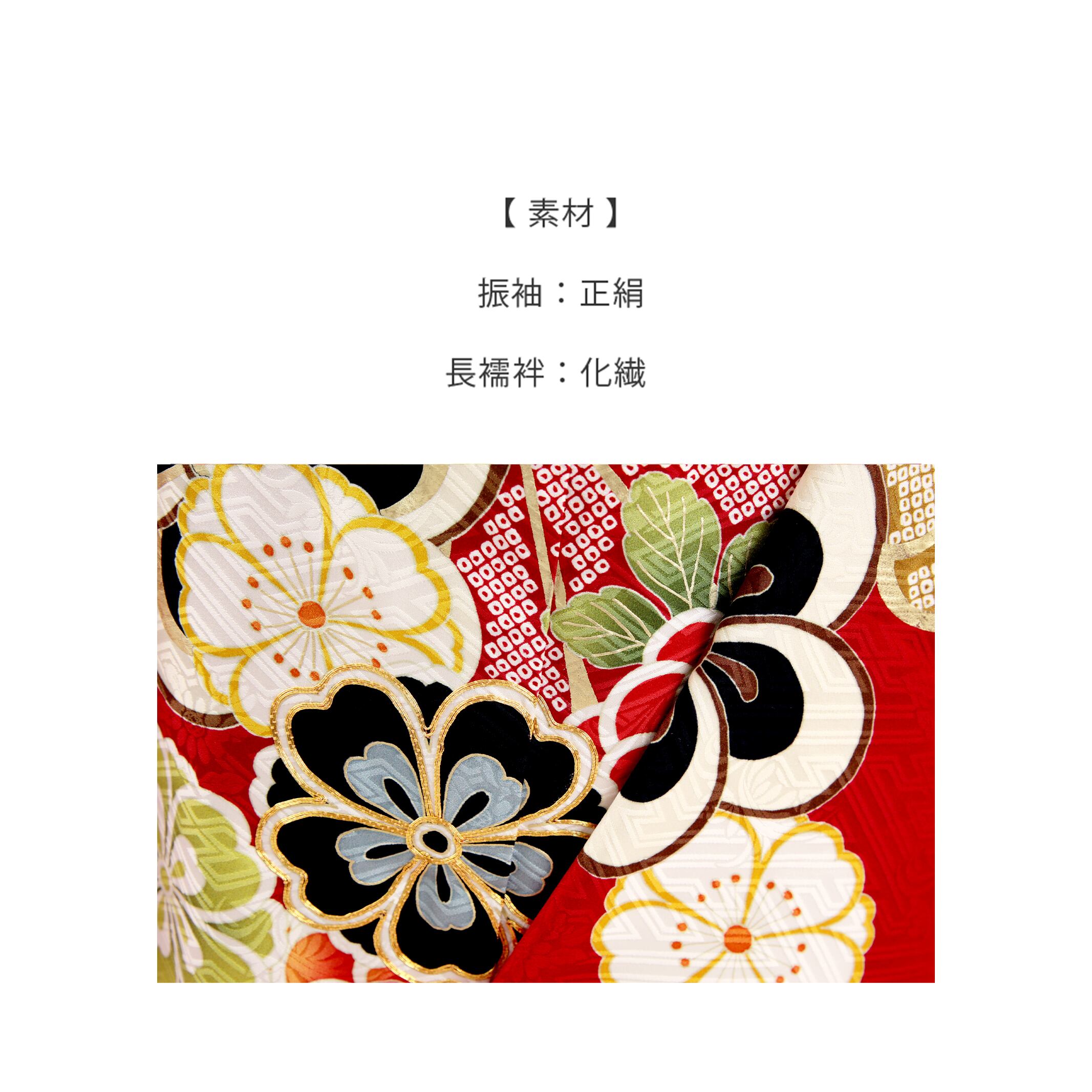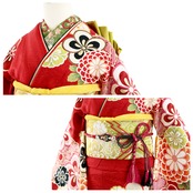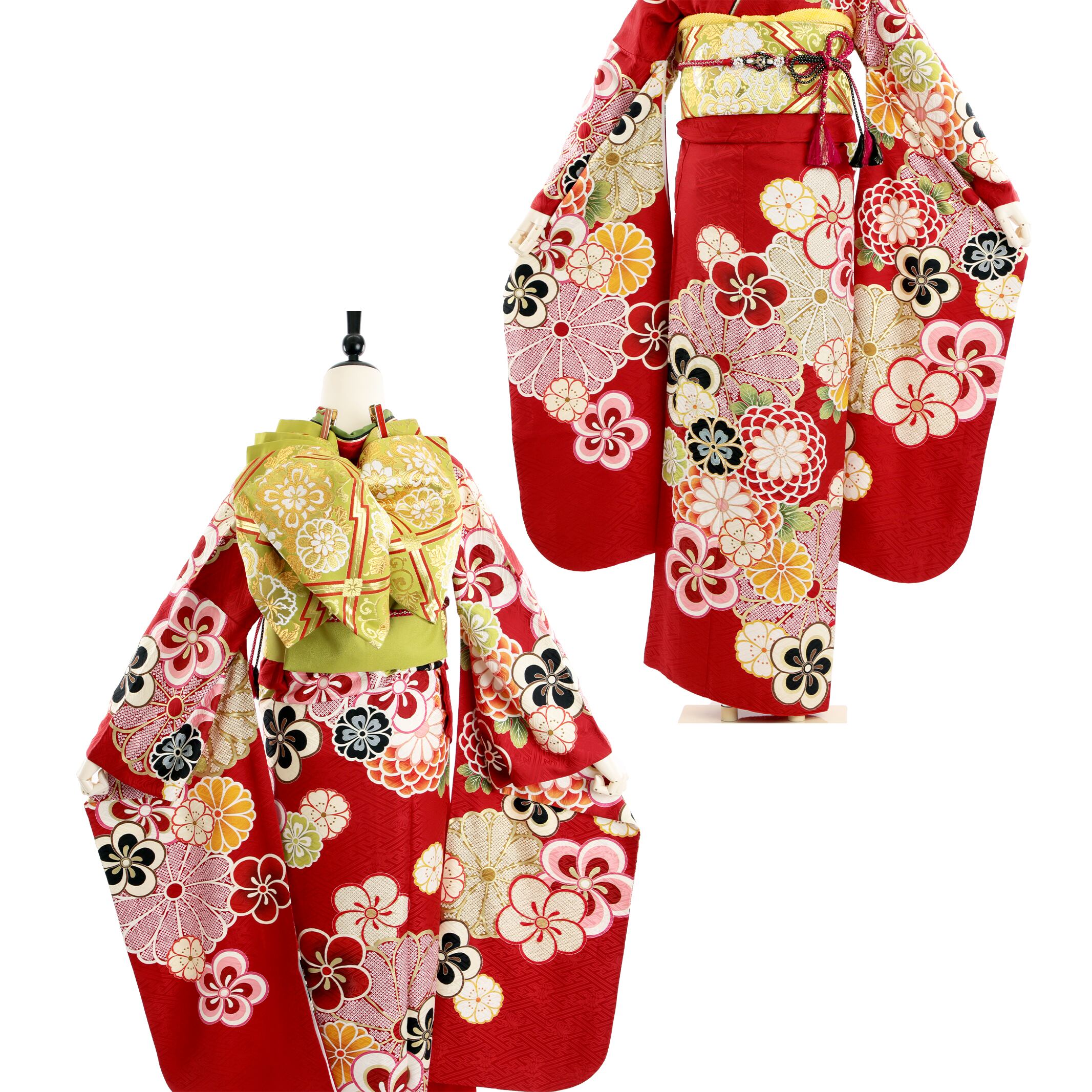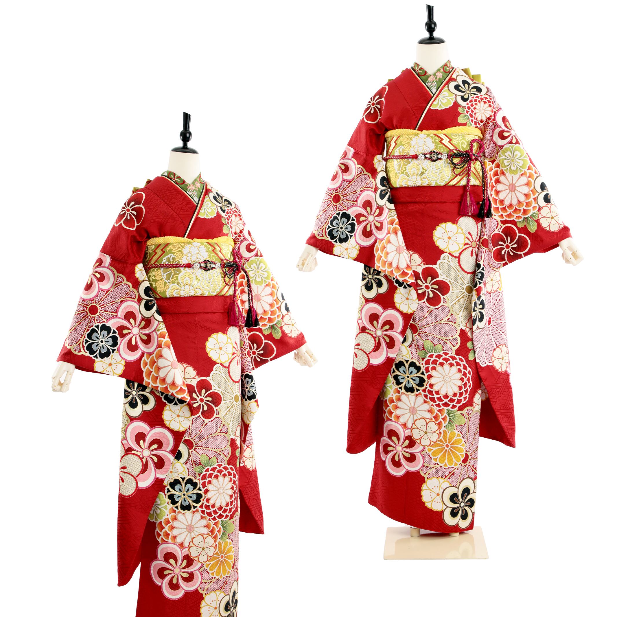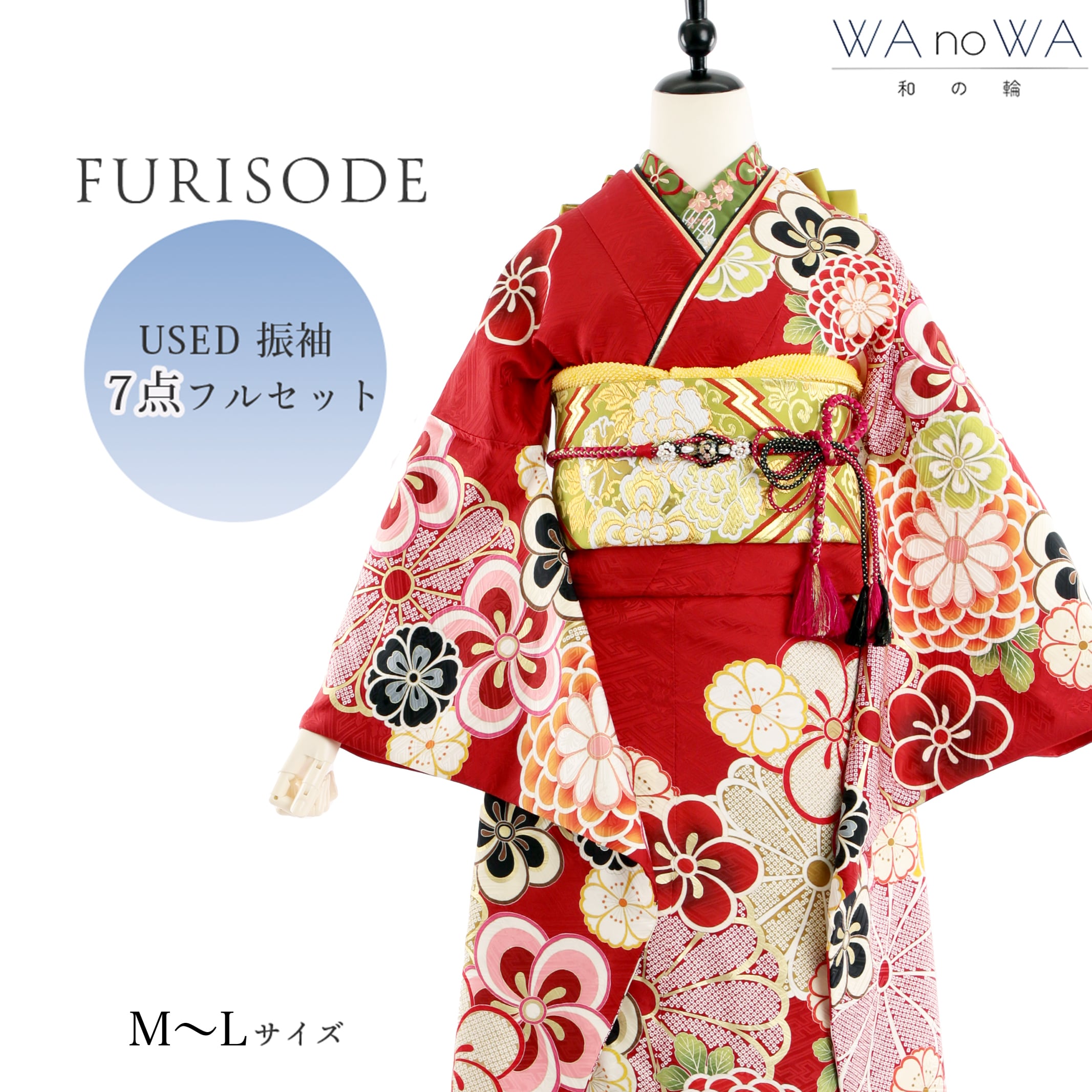 振袖 振袖セット USED振袖 赤 レトロ 梅 菊 7点フルセット レディース M〜Lサイズ WA-F-161