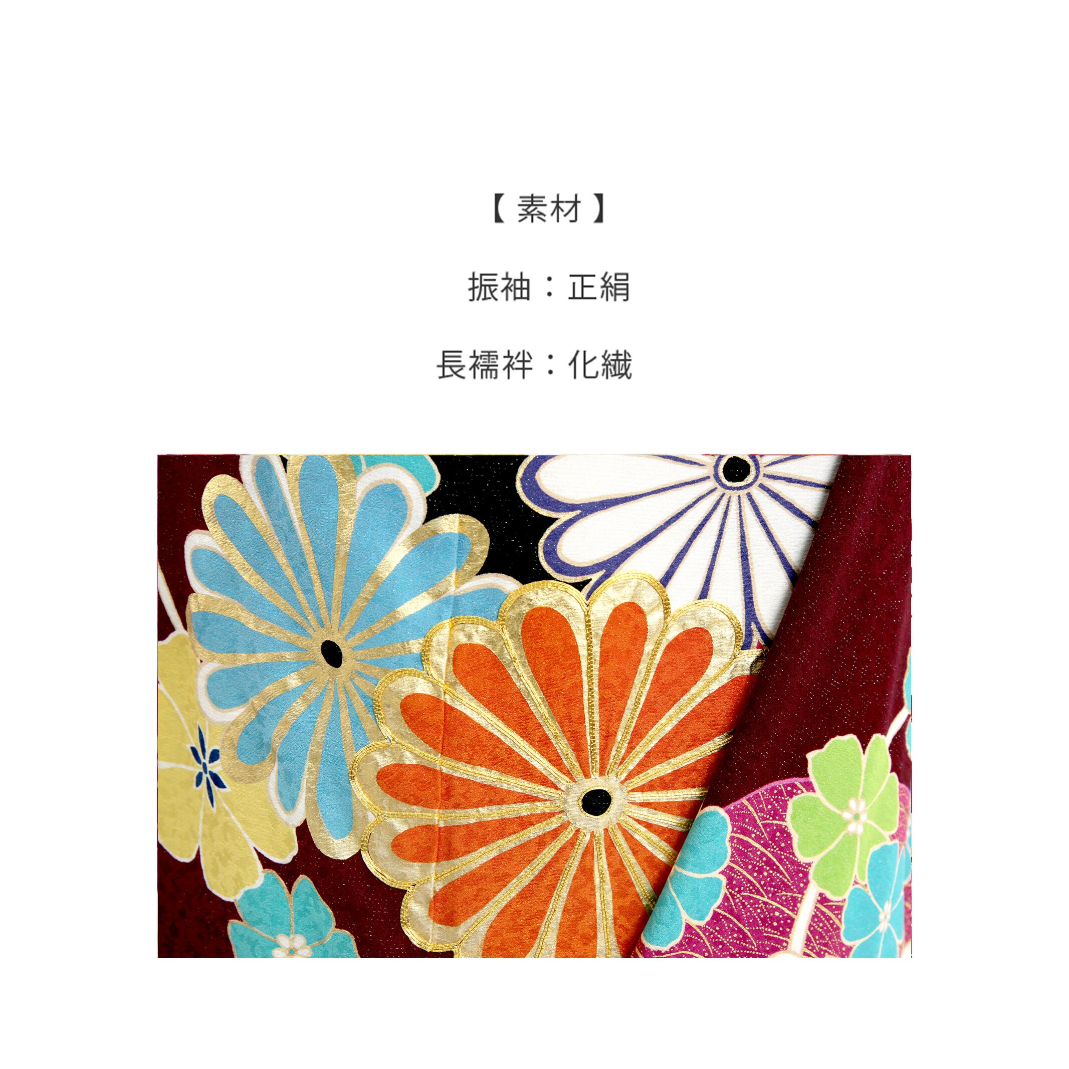 赤紫地に菊や金駒刺繍が華やかな振袖です。