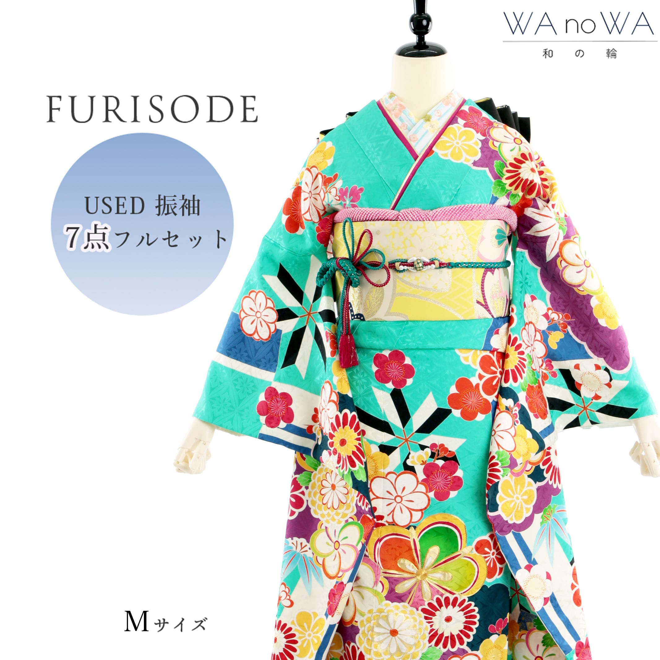 振袖 振袖セット USED振袖 水色 レトロ 梅 風車 7点フルセット レディース Mサイズ WA-F-172