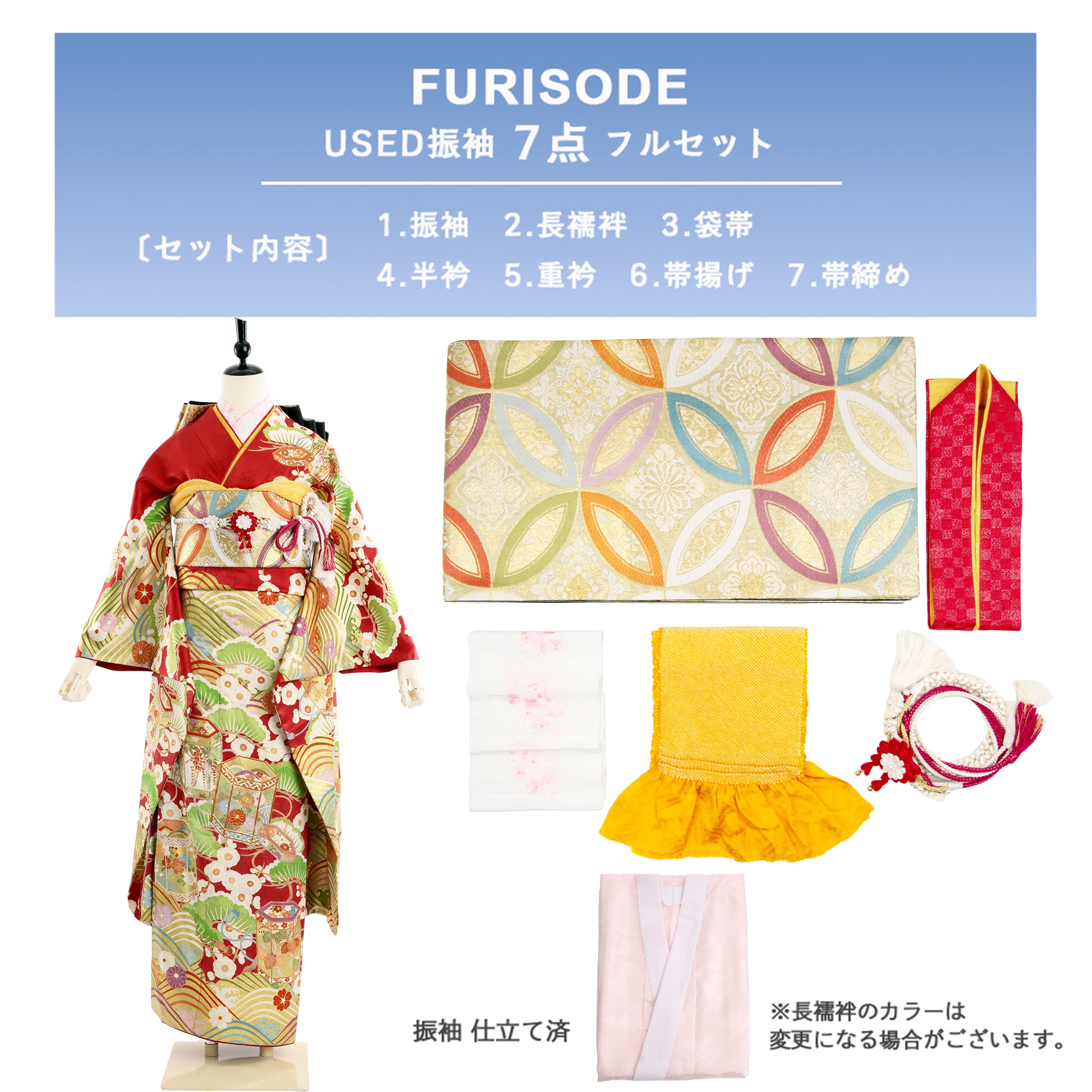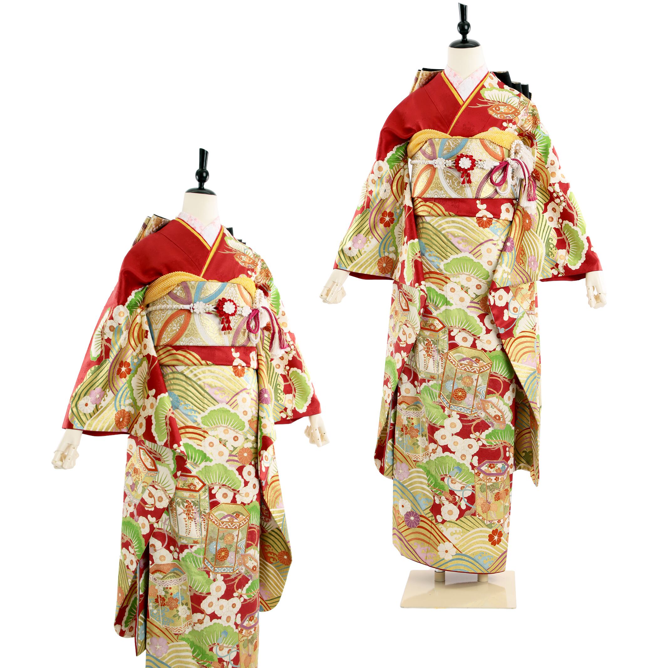 振袖 振袖セット USED振袖 赤 古典 波 貝桶 7点フルセット レディース Lサイズ WA-F-175
