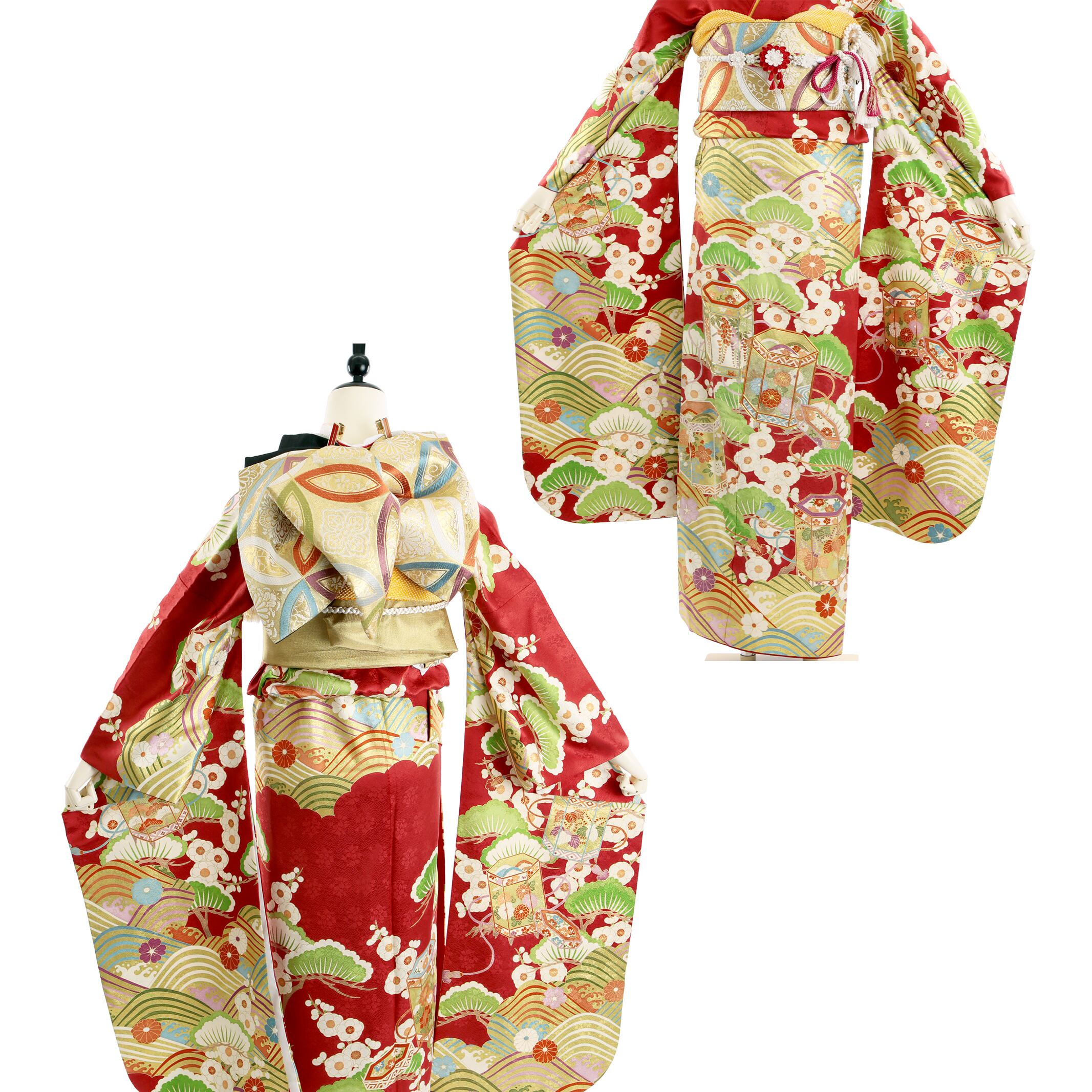 赤地に施された貝桶や松の模様がとても印象的で、堂々とした美しさを感じさせる古典振袖です。