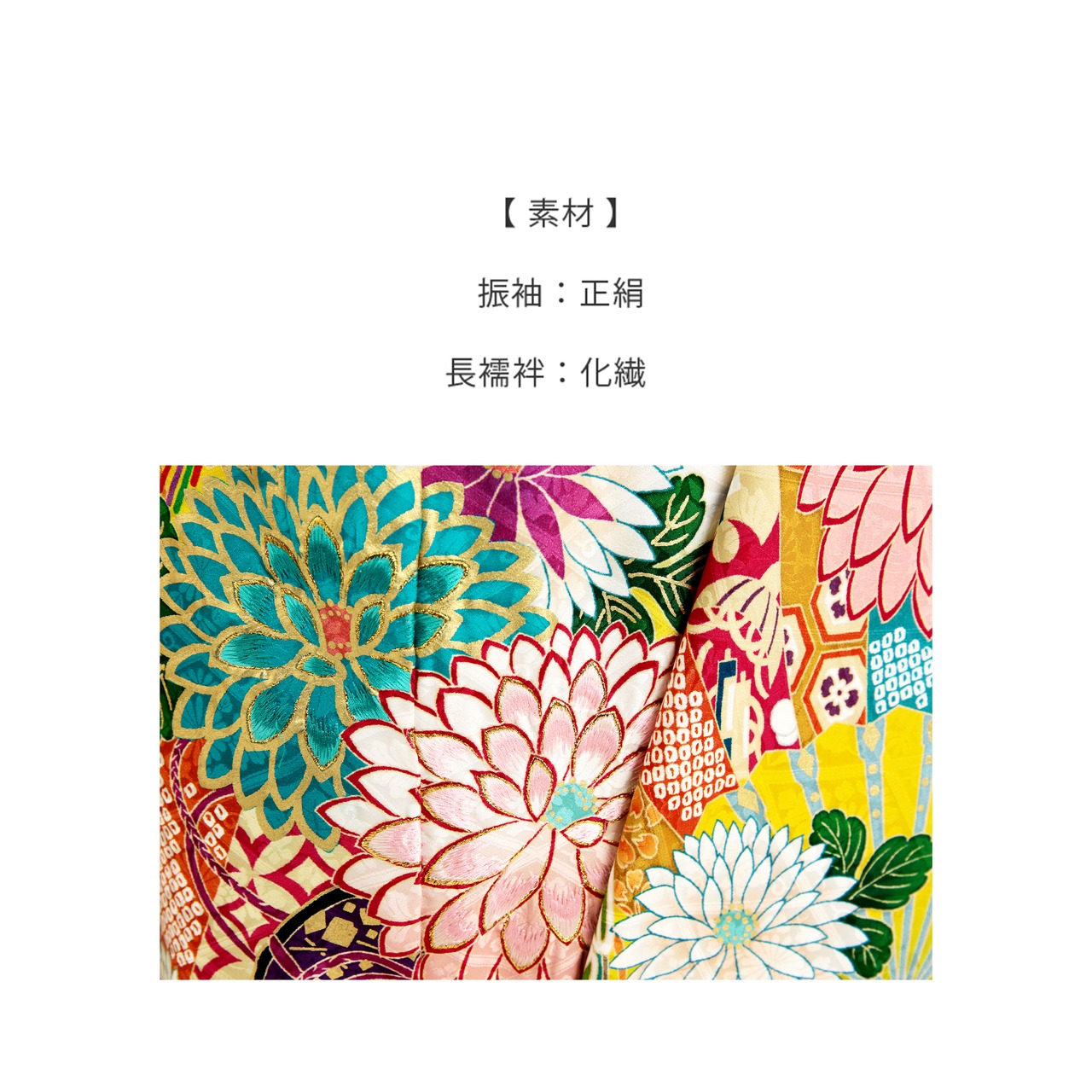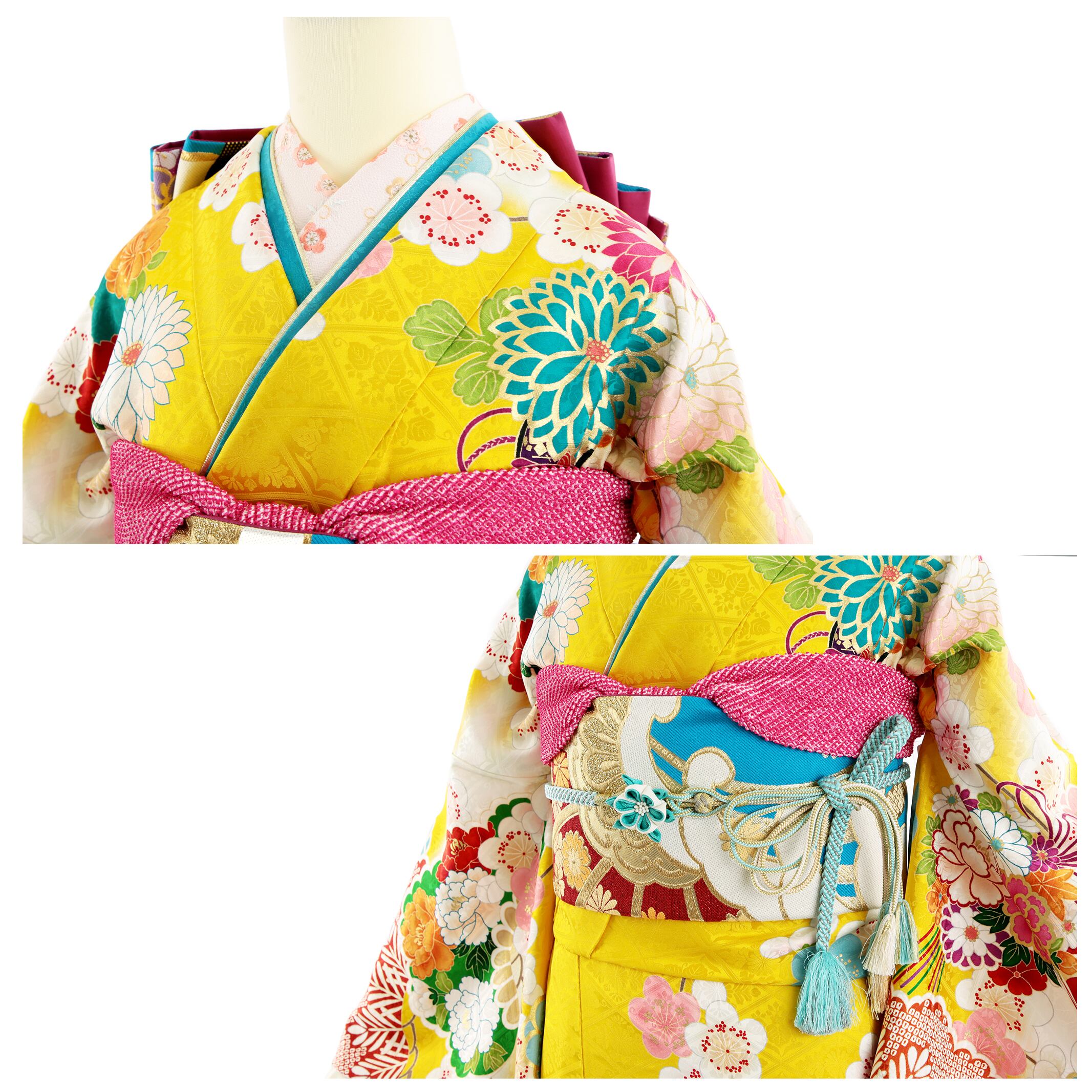 コーディネートは彩り豊かで華やかさが際立ち、菊のデザインには上品なラメ感があり、エレガントで魅力溢れる一枚となっています。