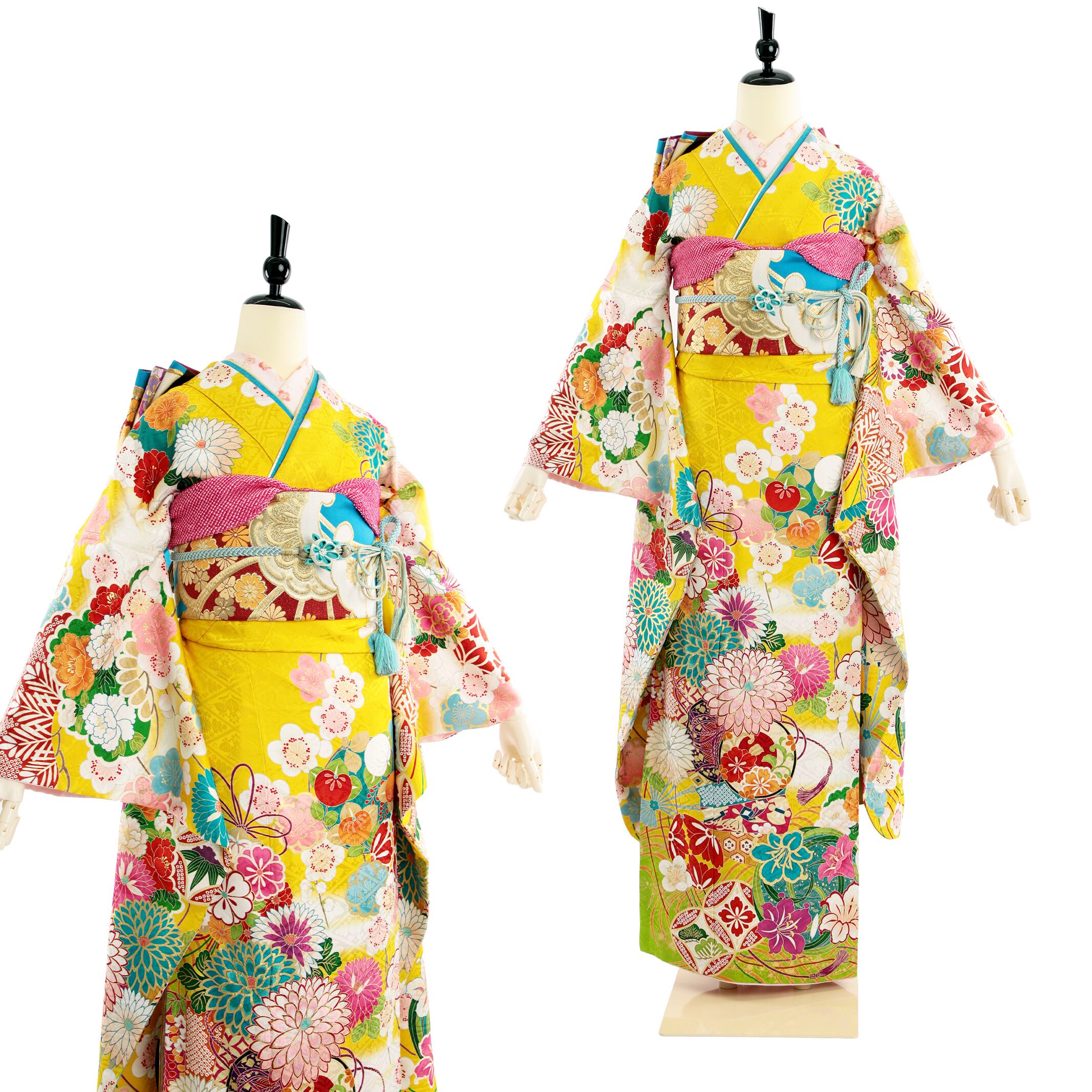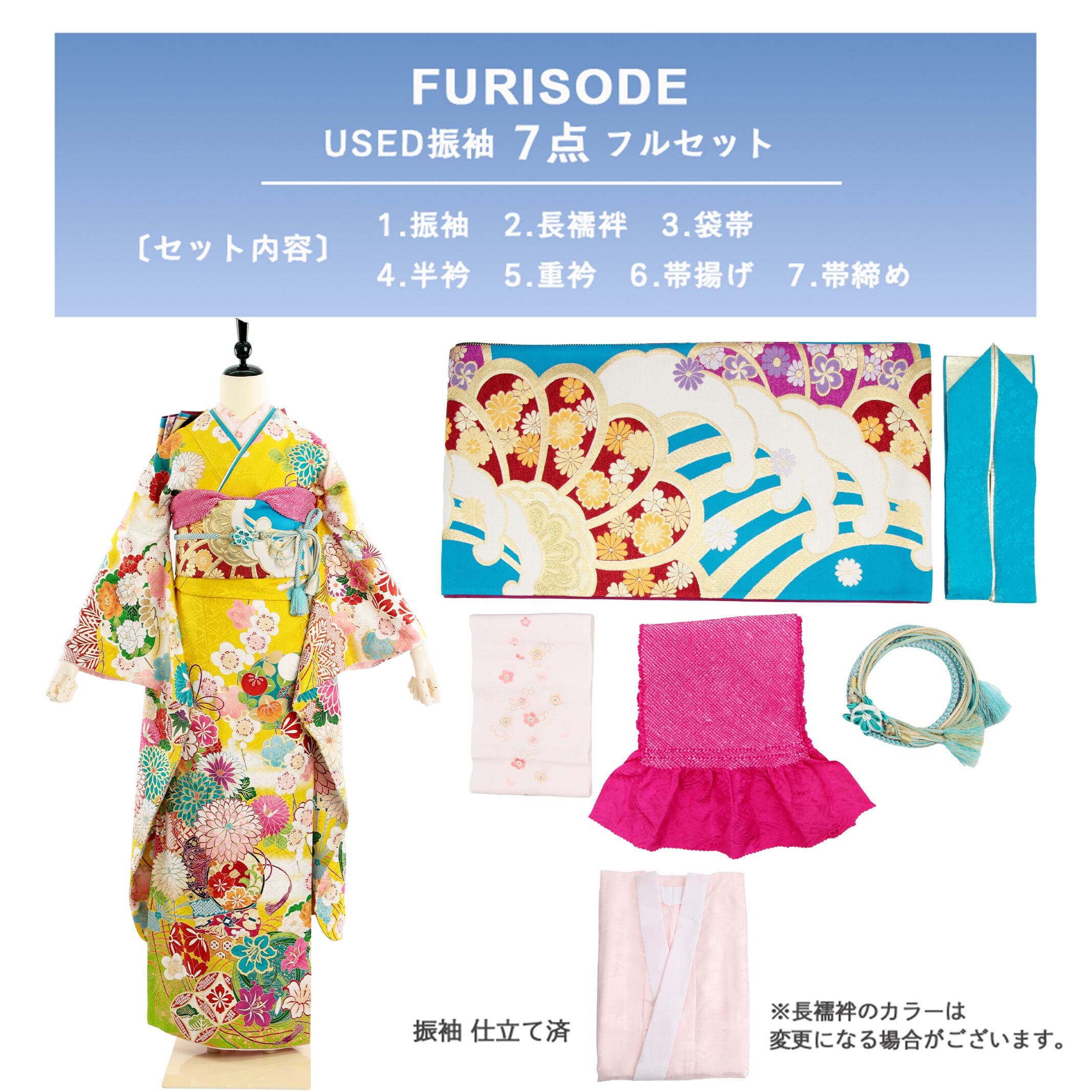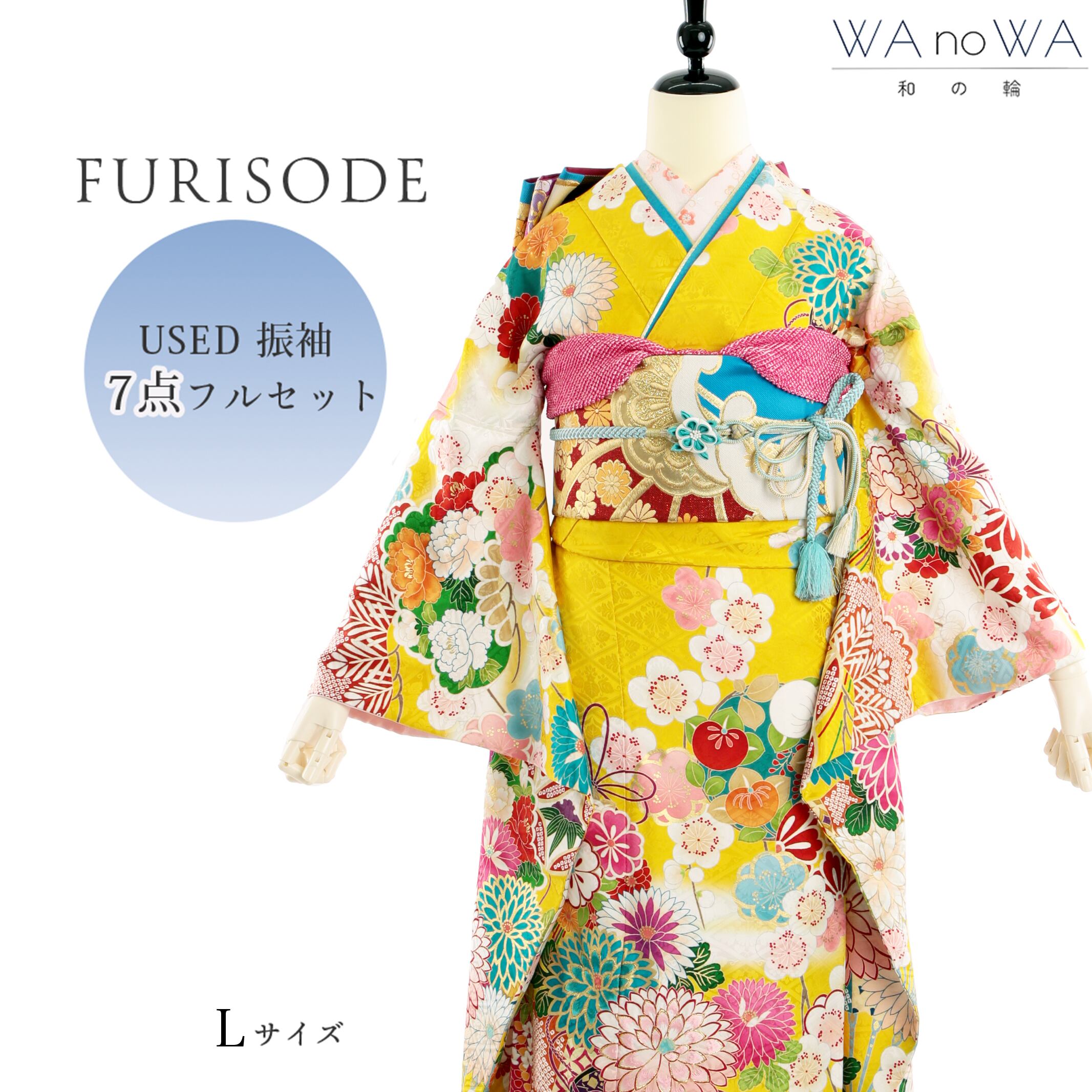 振袖 振袖セット USED振袖 黄色 新古典柄 鼓柄 菊 7点フルセット レディース Lサイズ WA-F-186