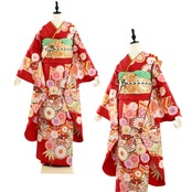 赤地に糸巻きや菊が印象的な古典柄の振袖です。