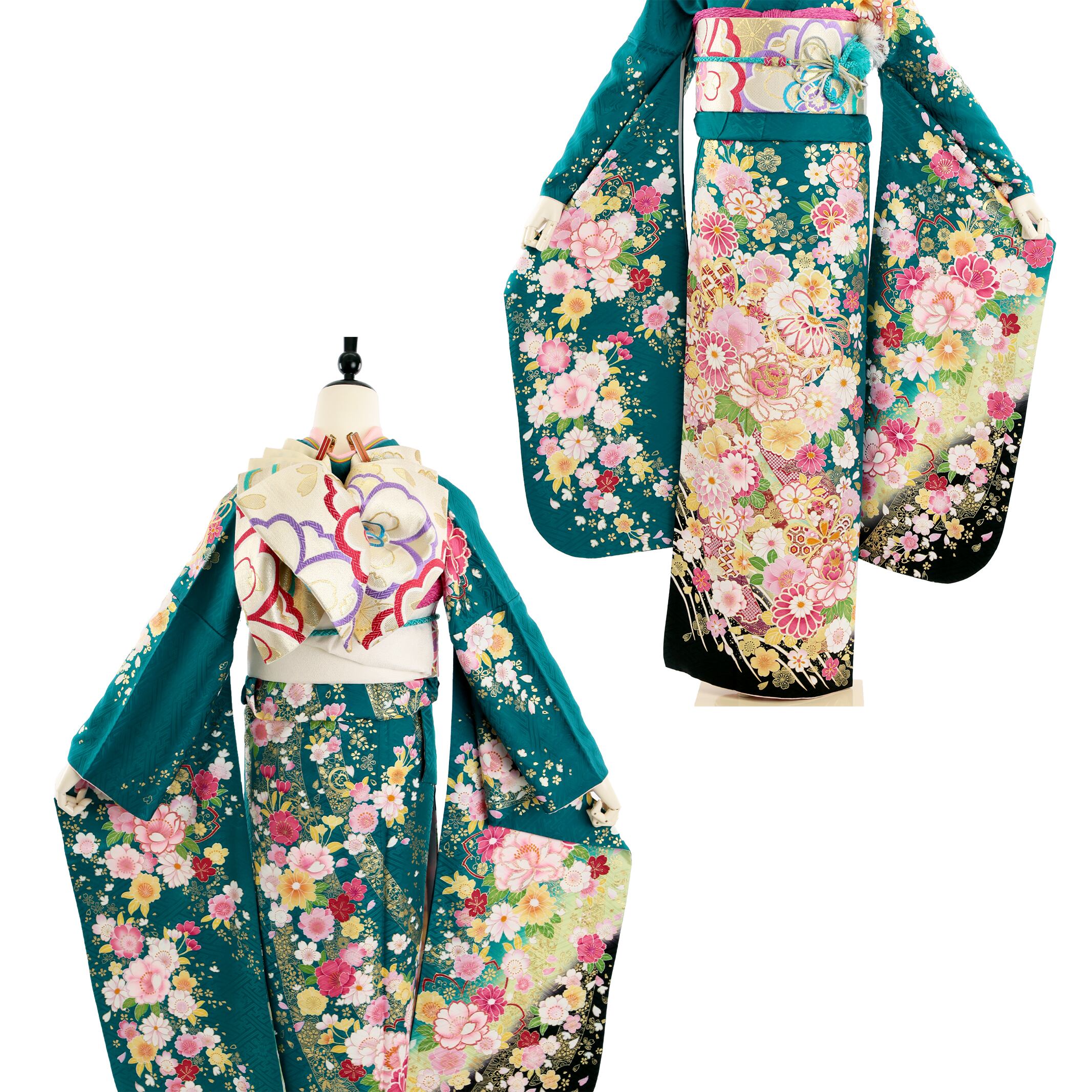 青緑地に鞠や牡丹が印象的な新古典振袖です。