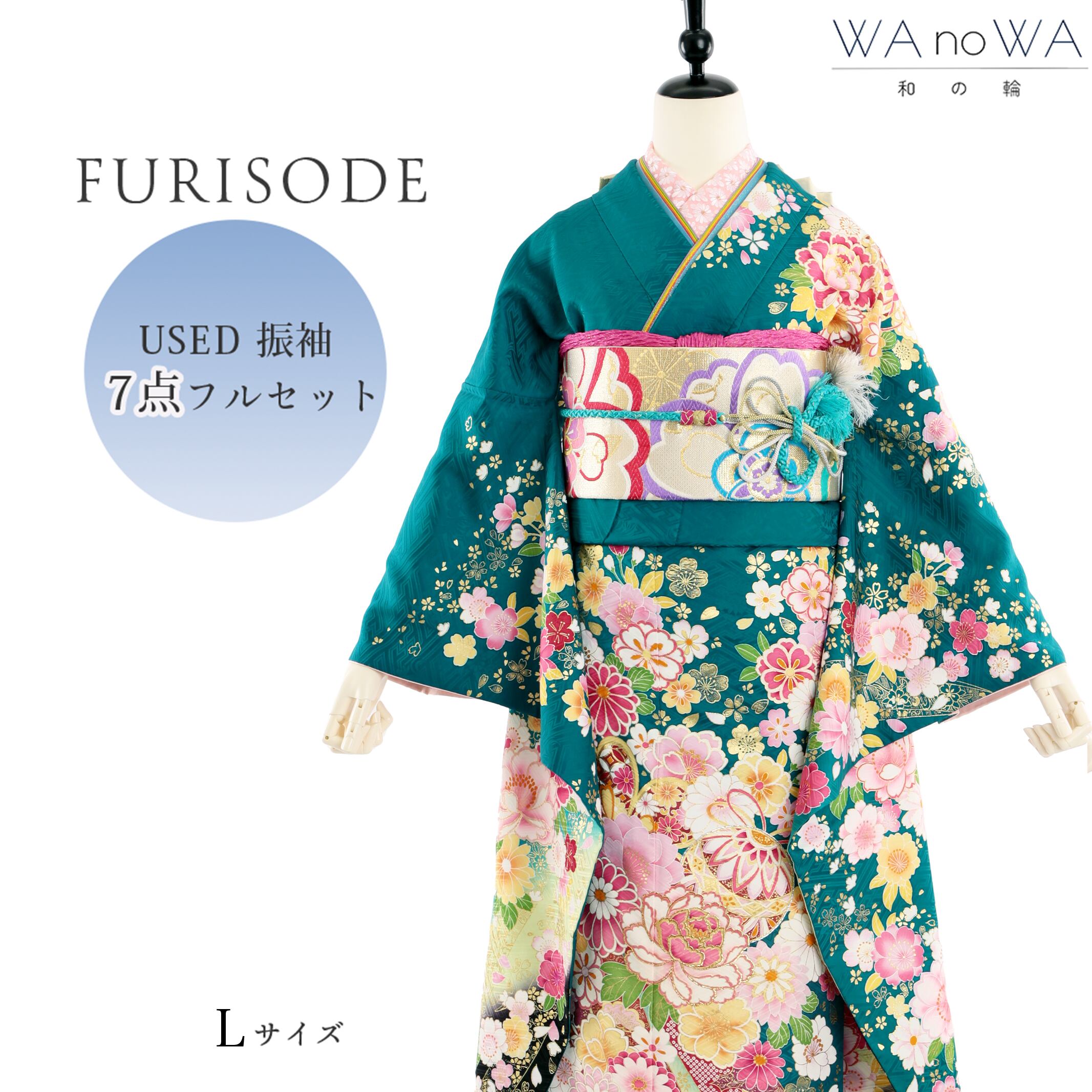 振袖 振袖セット USED振袖 青緑 新古典柄 鞠 牡丹 7点フルセット レディース M〜Lサイズ WA-F-194