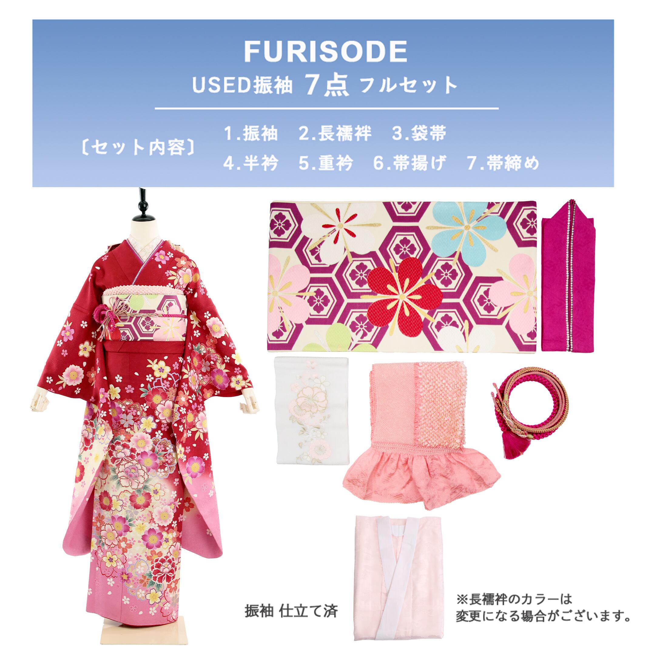 振袖 振袖セット USED振袖 赤 新古典柄 桜 牡丹 7点フルセット レディース Lサイズ WA-F-196