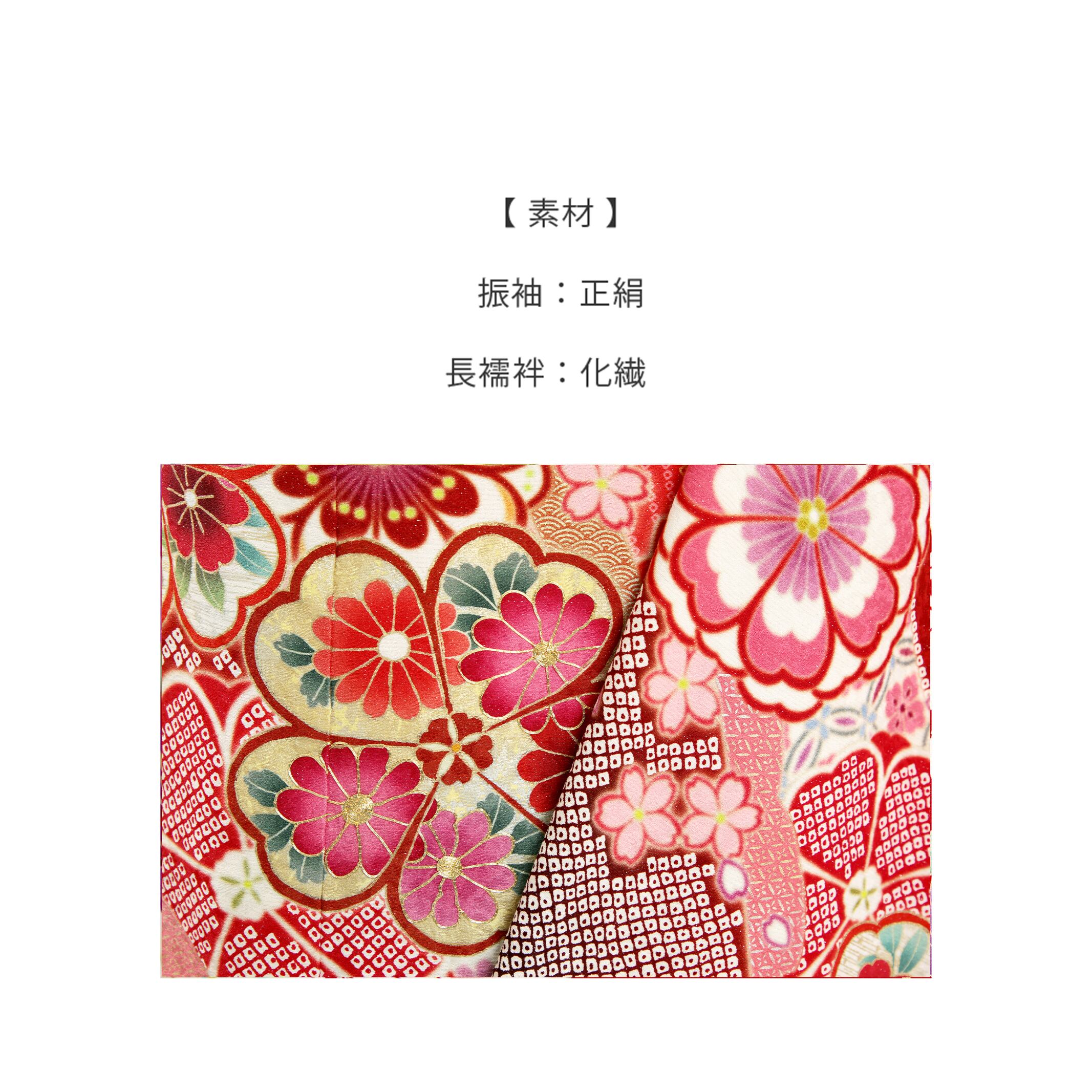 赤地に桜や鹿の子が印象的な古典振袖です。