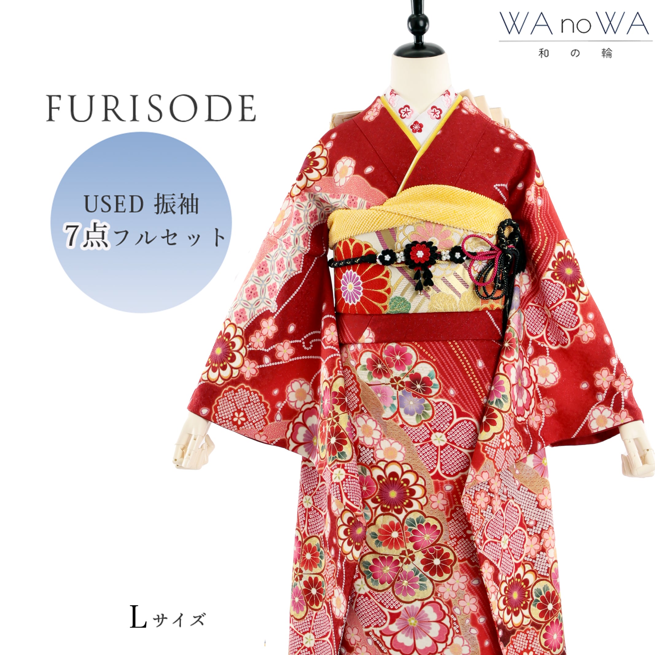 振袖 振袖セット USED振袖 赤 新古典柄 桜 七宝 7点フルセット レディース Lサイズ WA-F-198