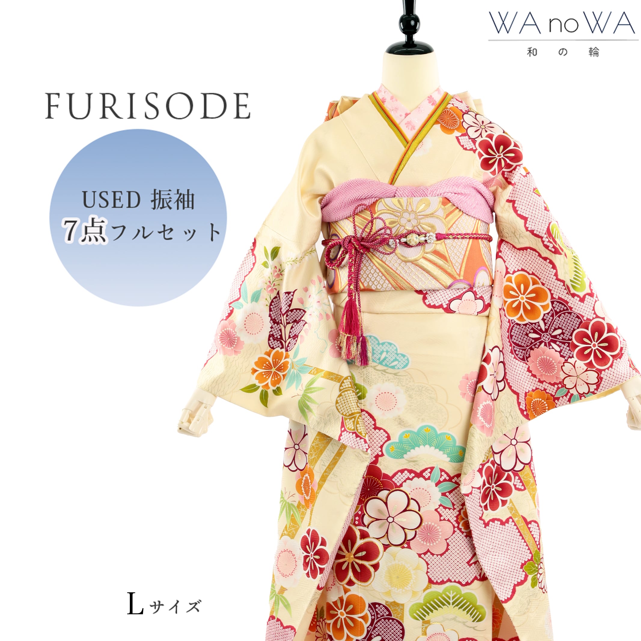 振袖 振袖セット USED振袖 クリーム レトロ 古典柄 松竹梅 7点フルセット レディース Lサイズ WA-F-207
