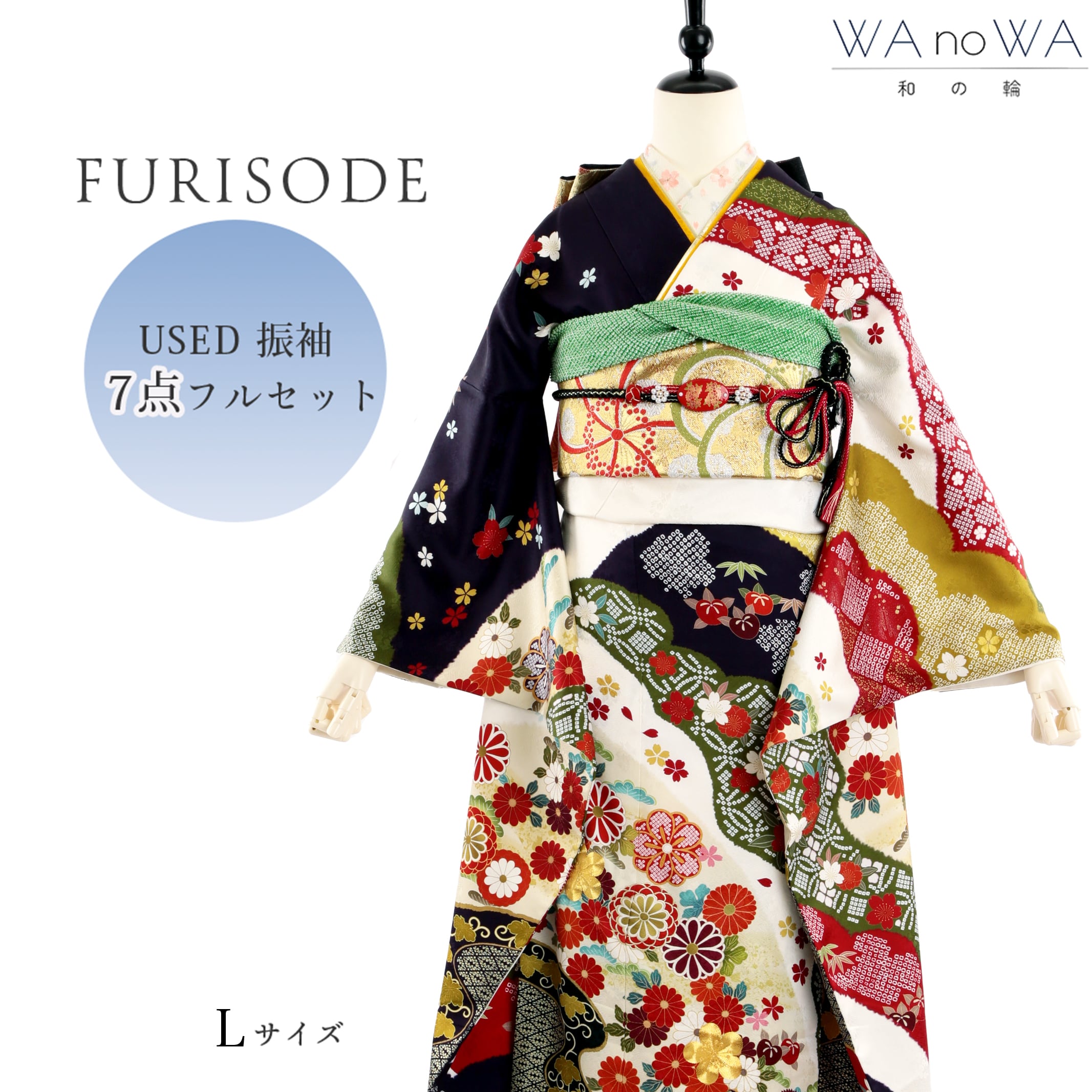 振袖 振袖セット USED振袖 白 古典柄 雲取り 金駒刺繍 7点フルセット レディース Lサイズ WA-F-208