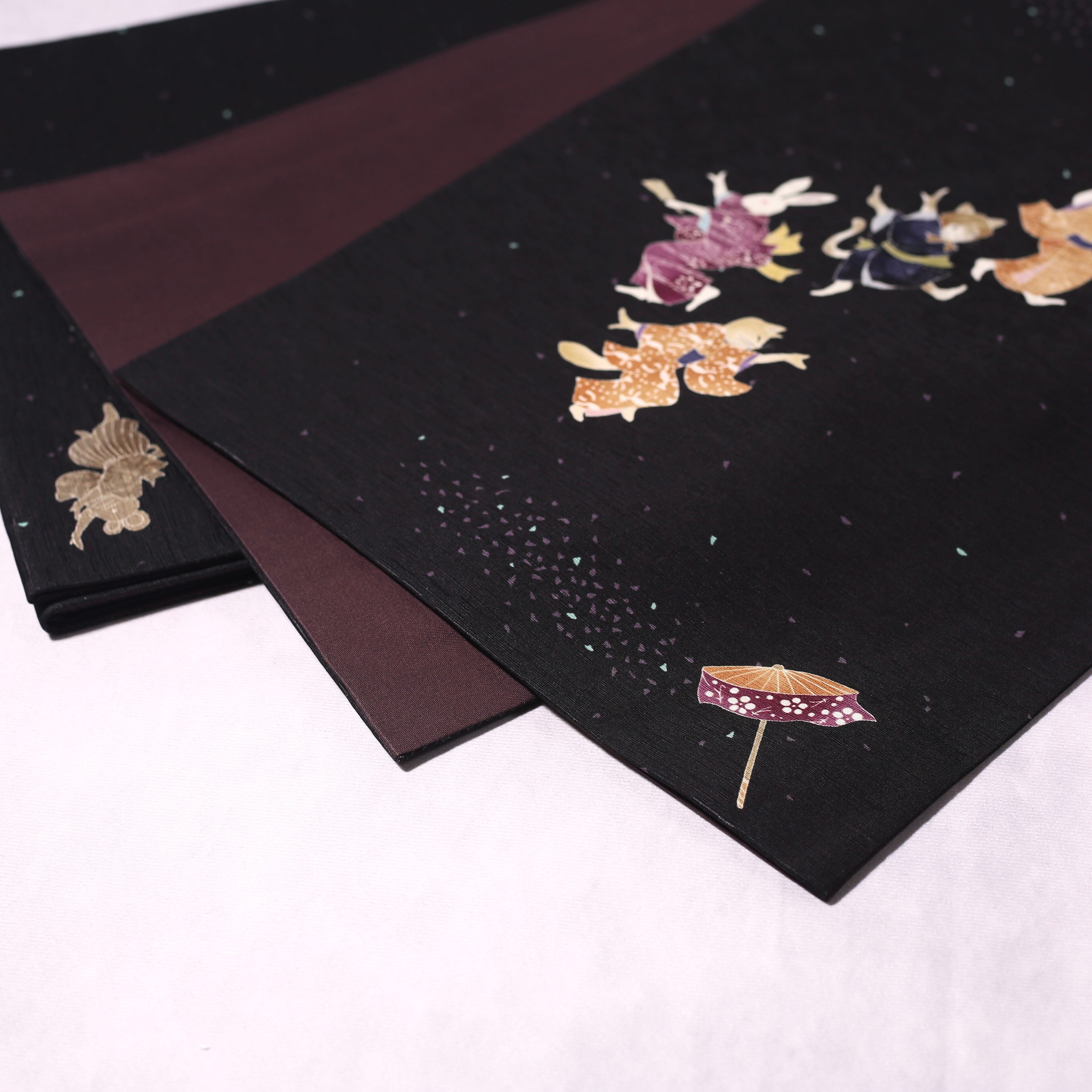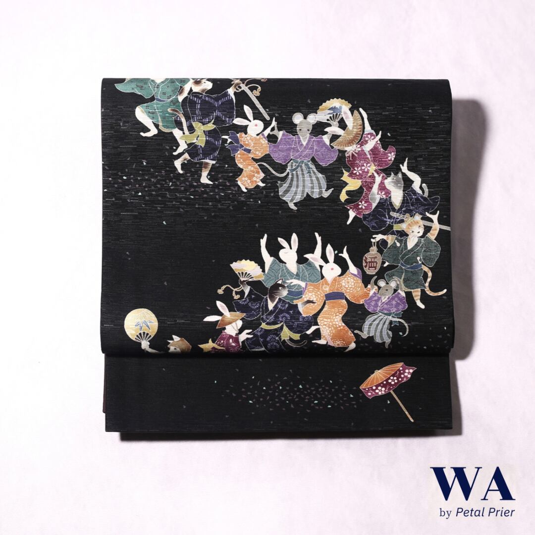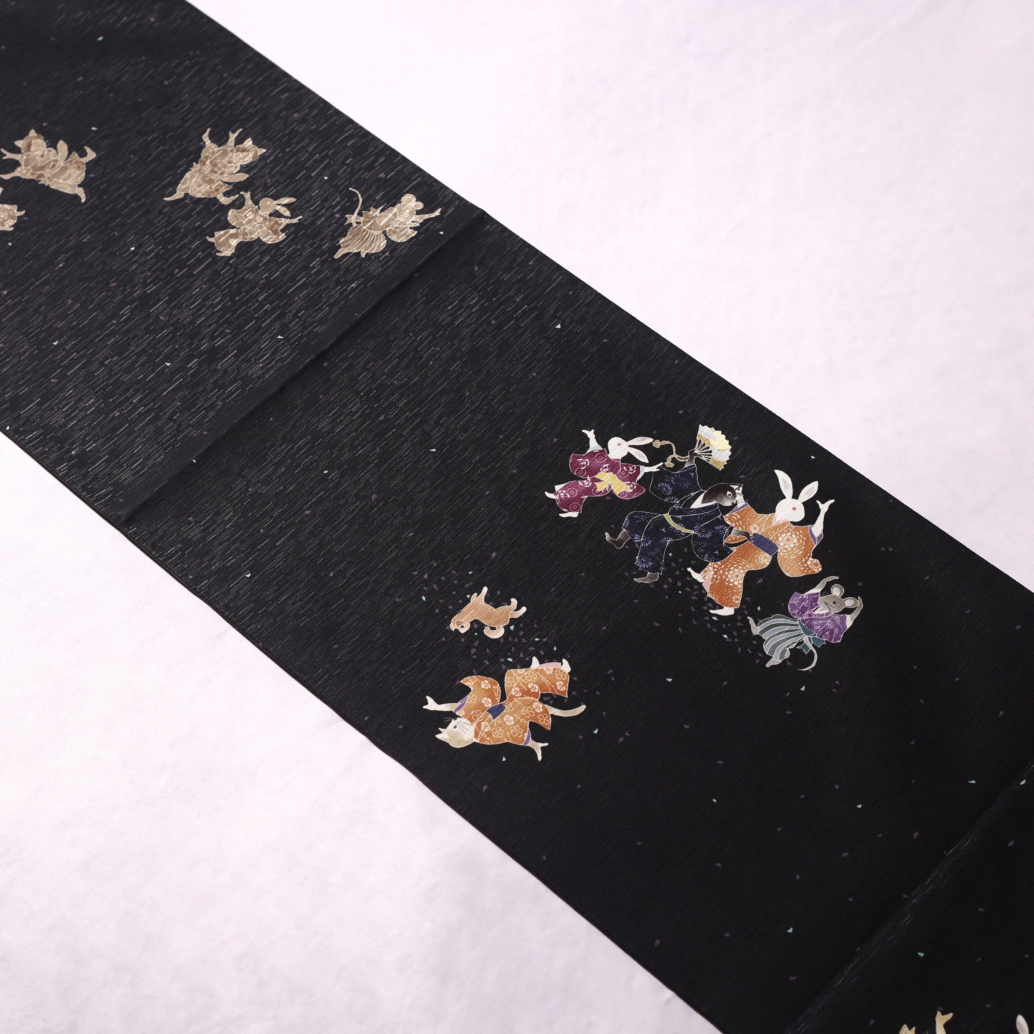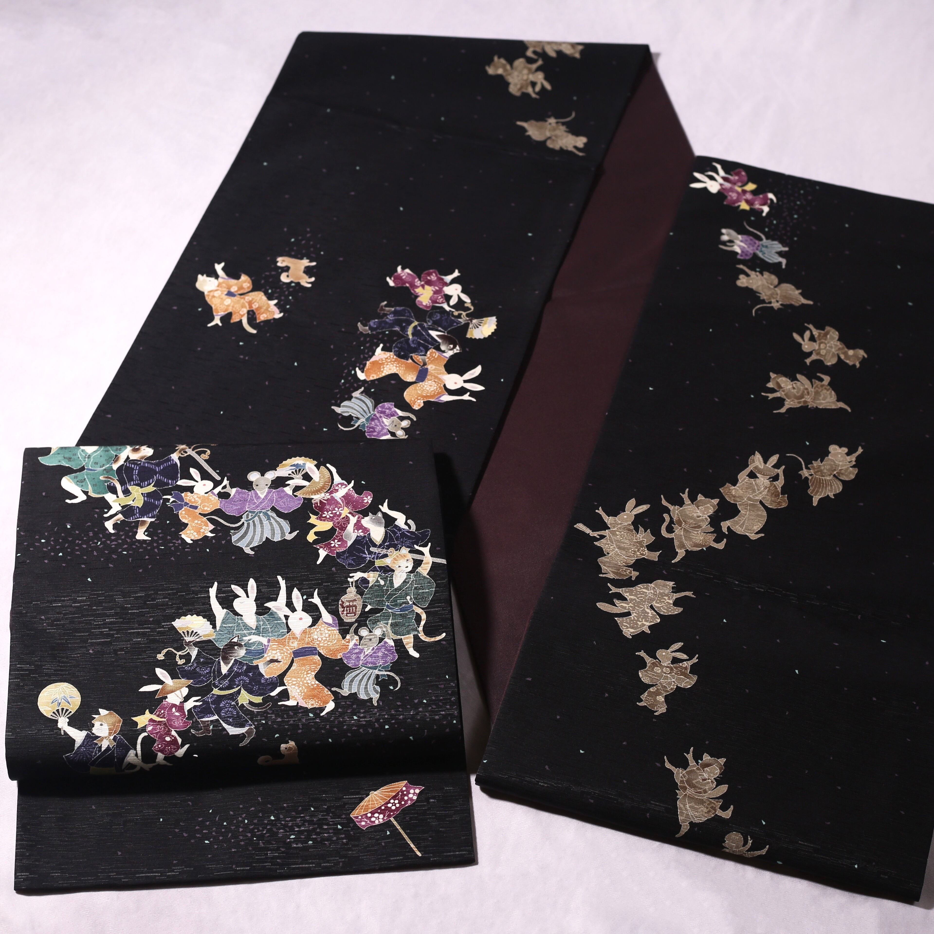 カラフルな着物を着た動物たち。ええじゃないかと踊る、珍しい柄です。
