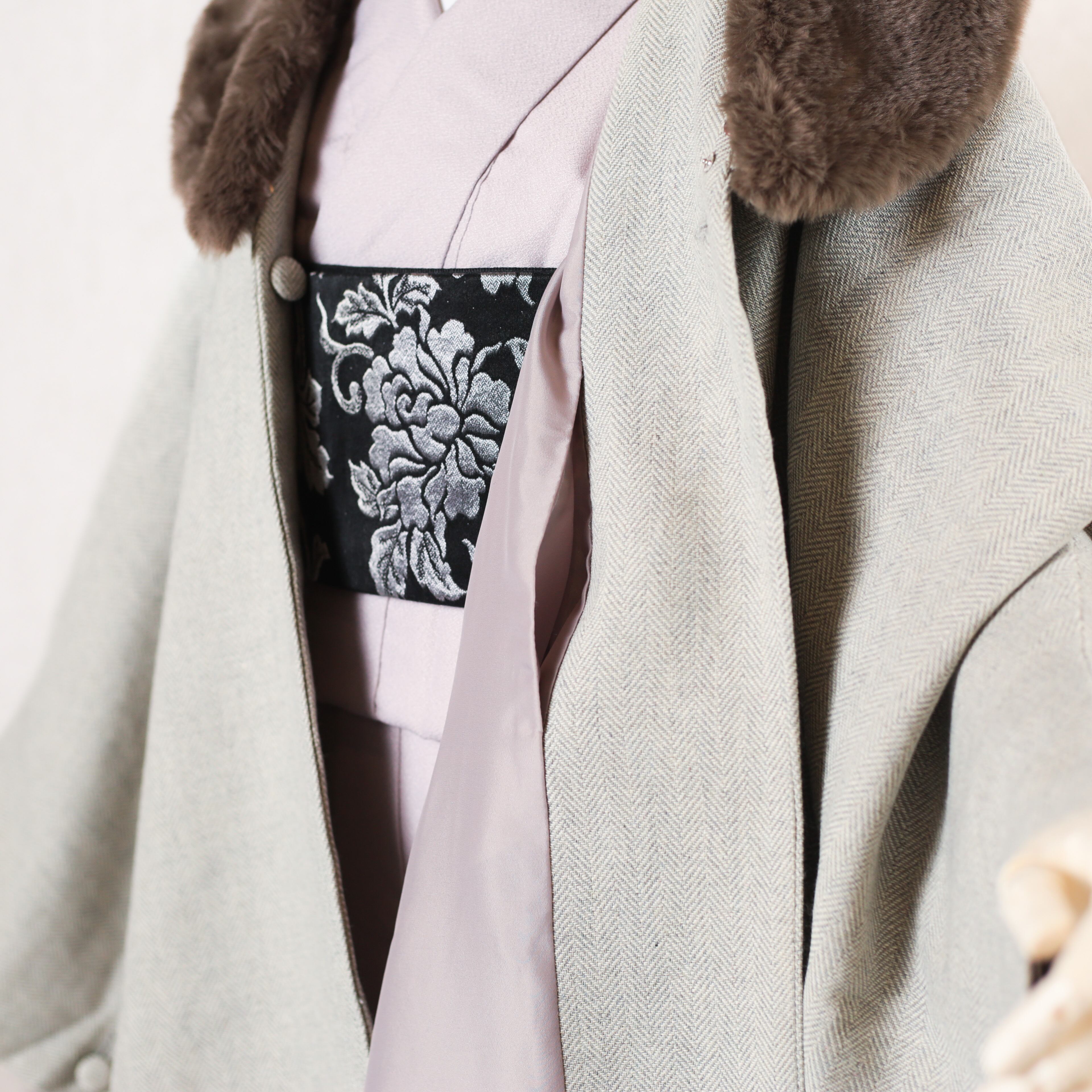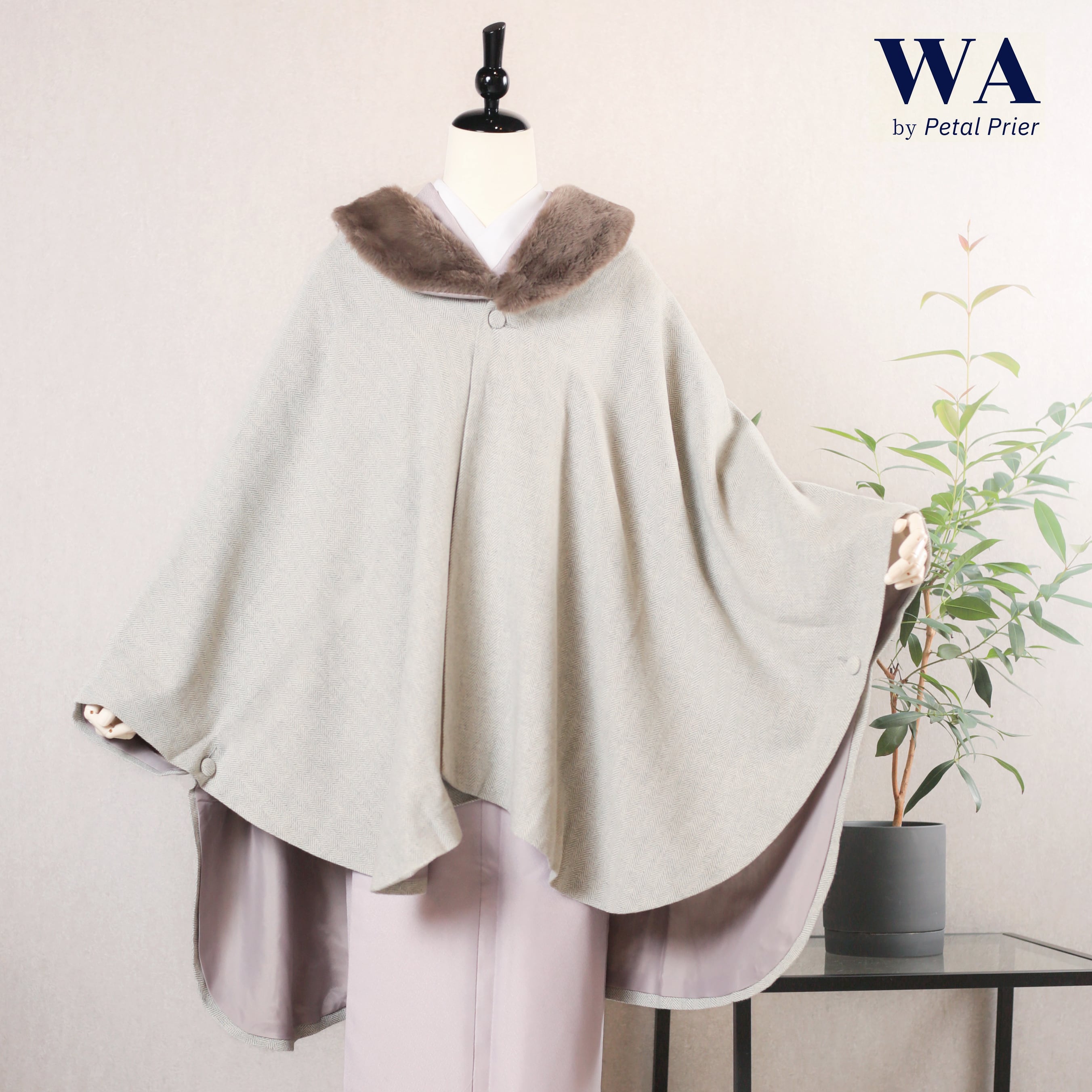 新品・未使用 ケープ コート JAPAN MODE【グレー×ヘリンボーン】ファー ポンチョ 2way 冬 ウール混紡 着物 和装 和洋兼用 C-8