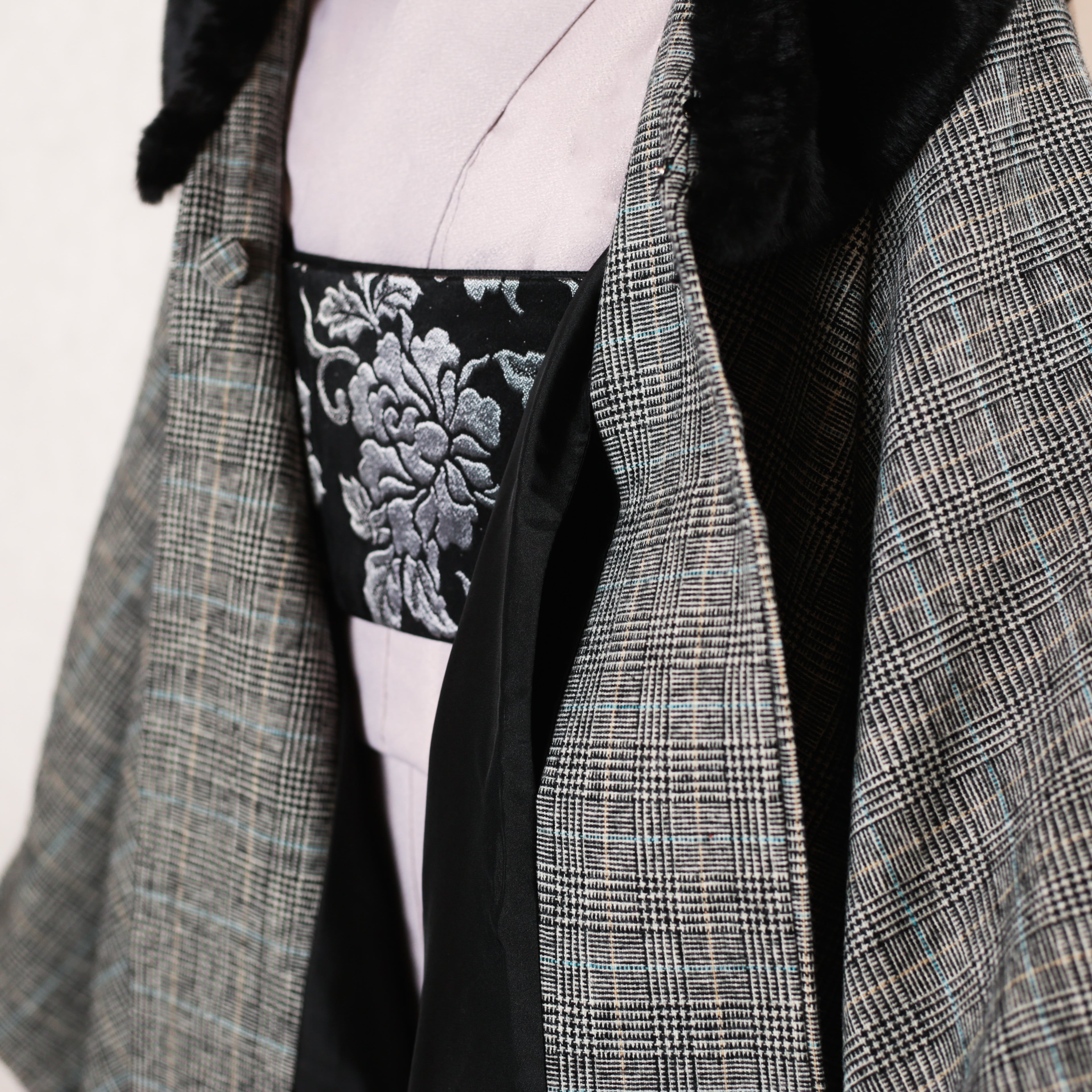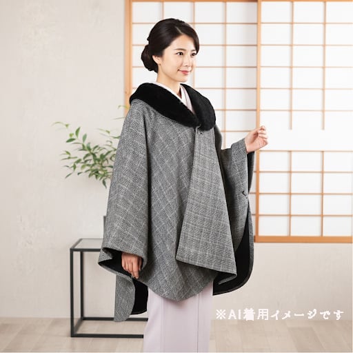 新品・未使用 ケープ コート JAPAN MODE【ブラック×グレンチェック】ファー ポンチョ 2way 冬 ウール混紡 着物 和装 和洋兼用 C-9