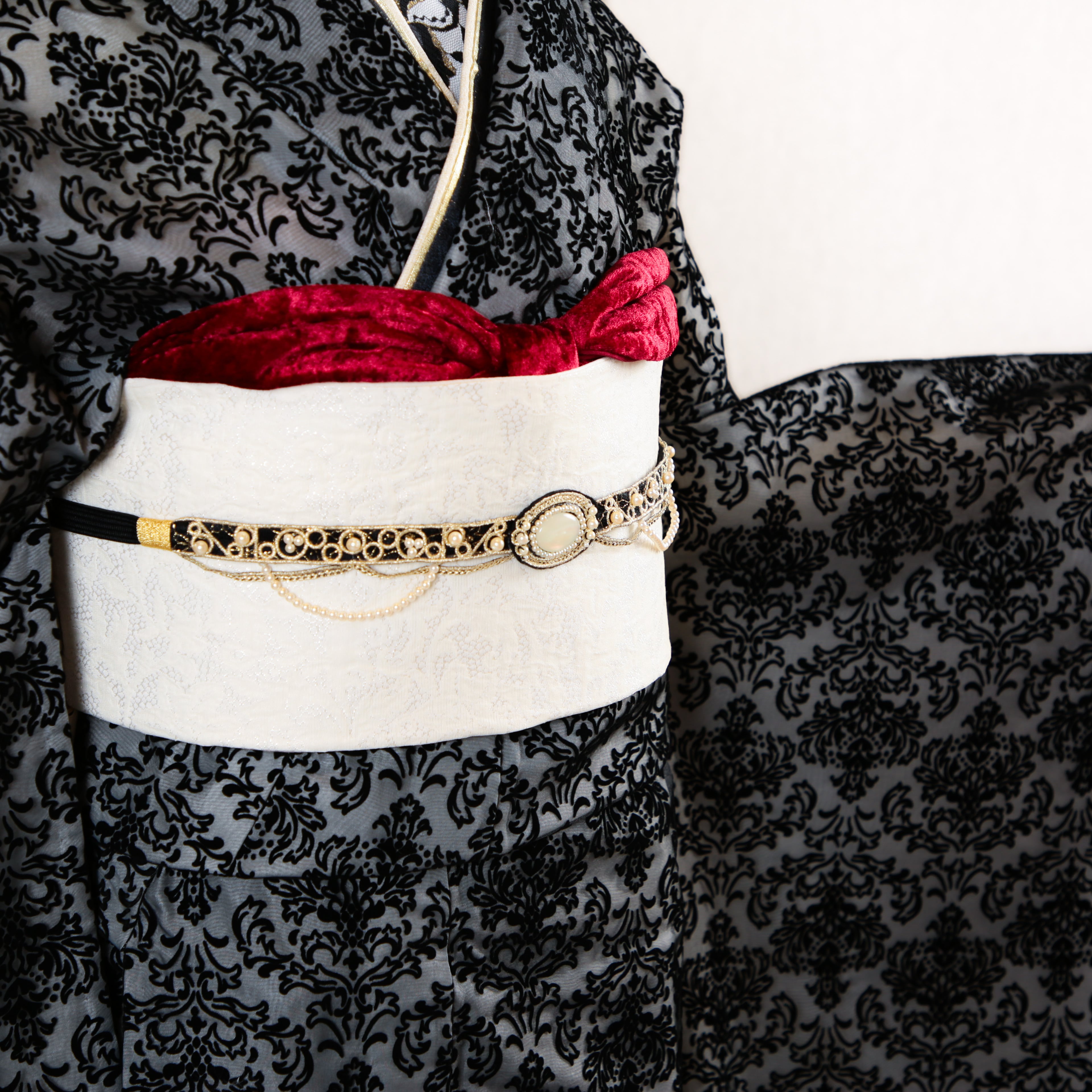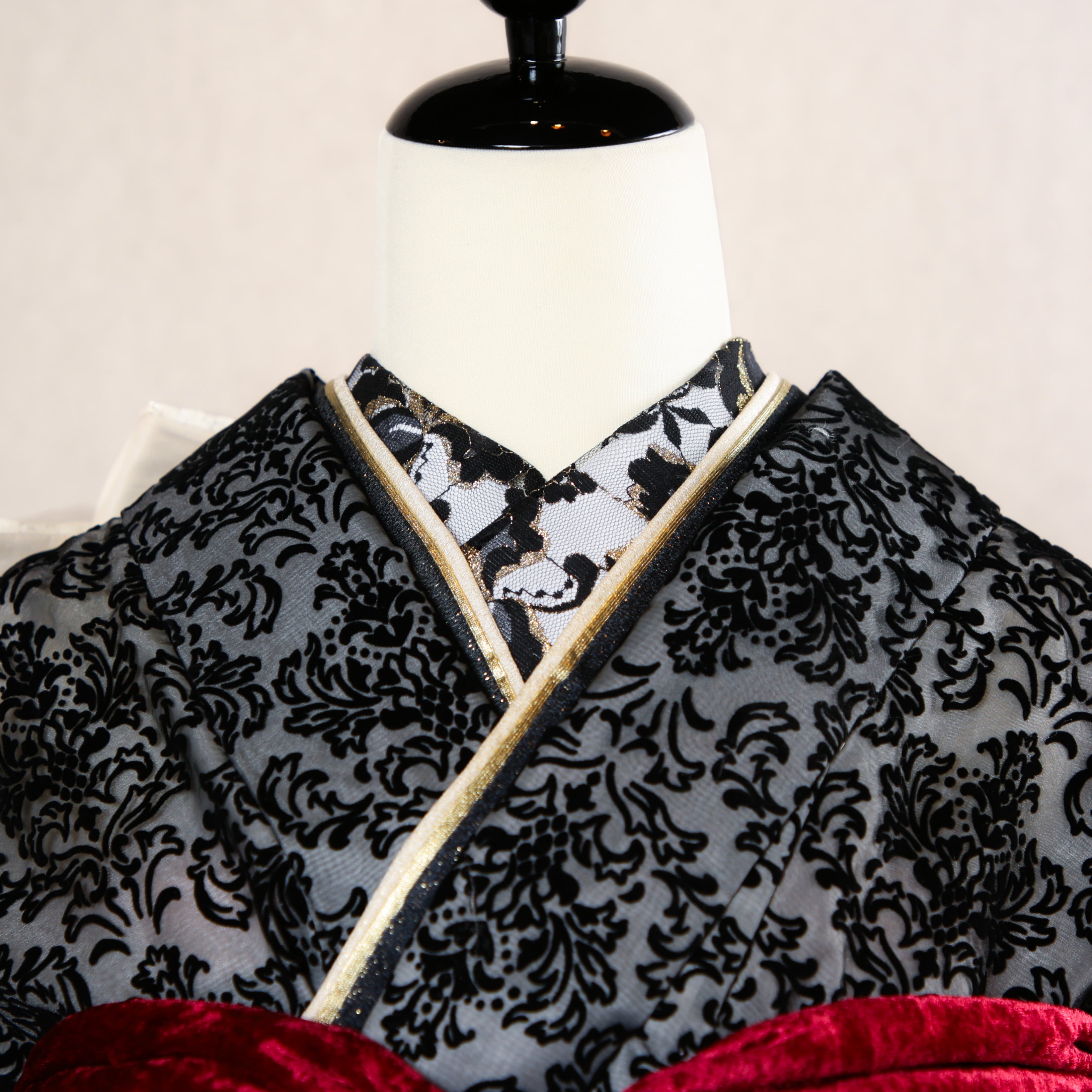 漆黒のダマスク模様が全面に浮き上がる、重厚感あふれるモダン振袖です。