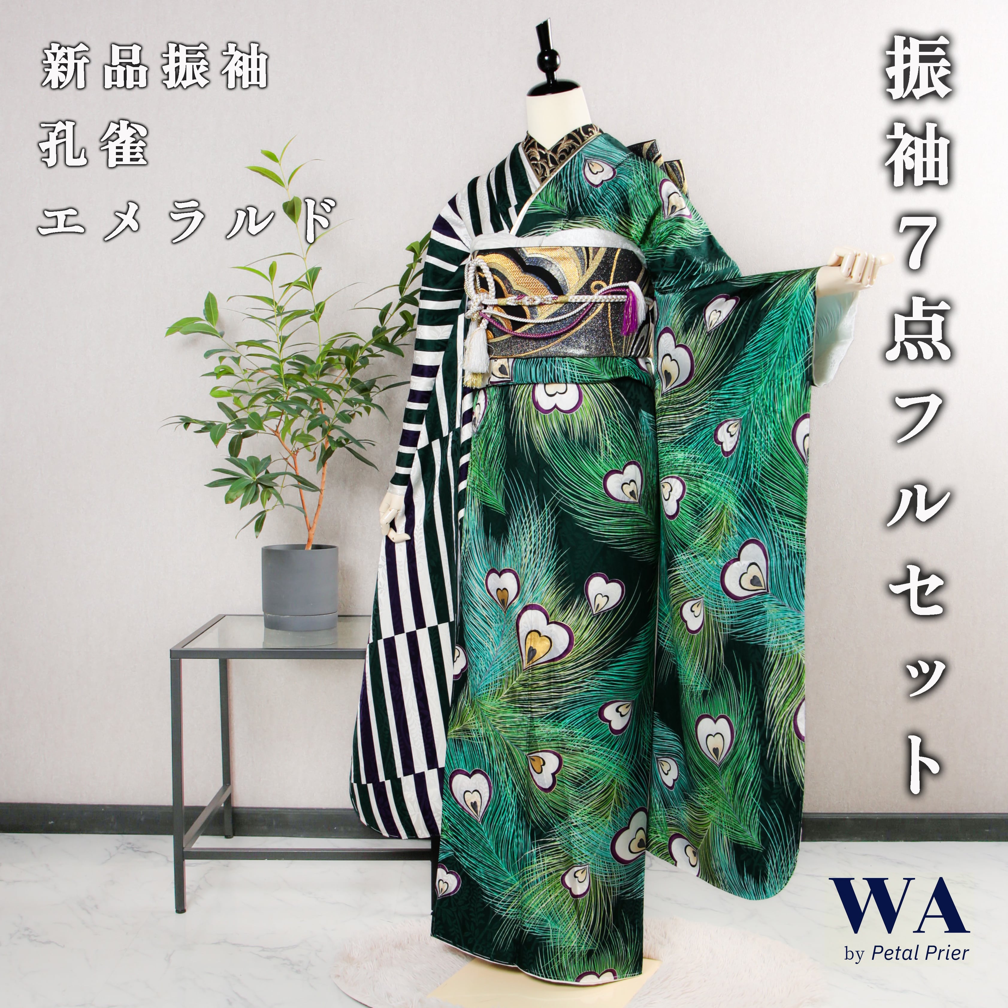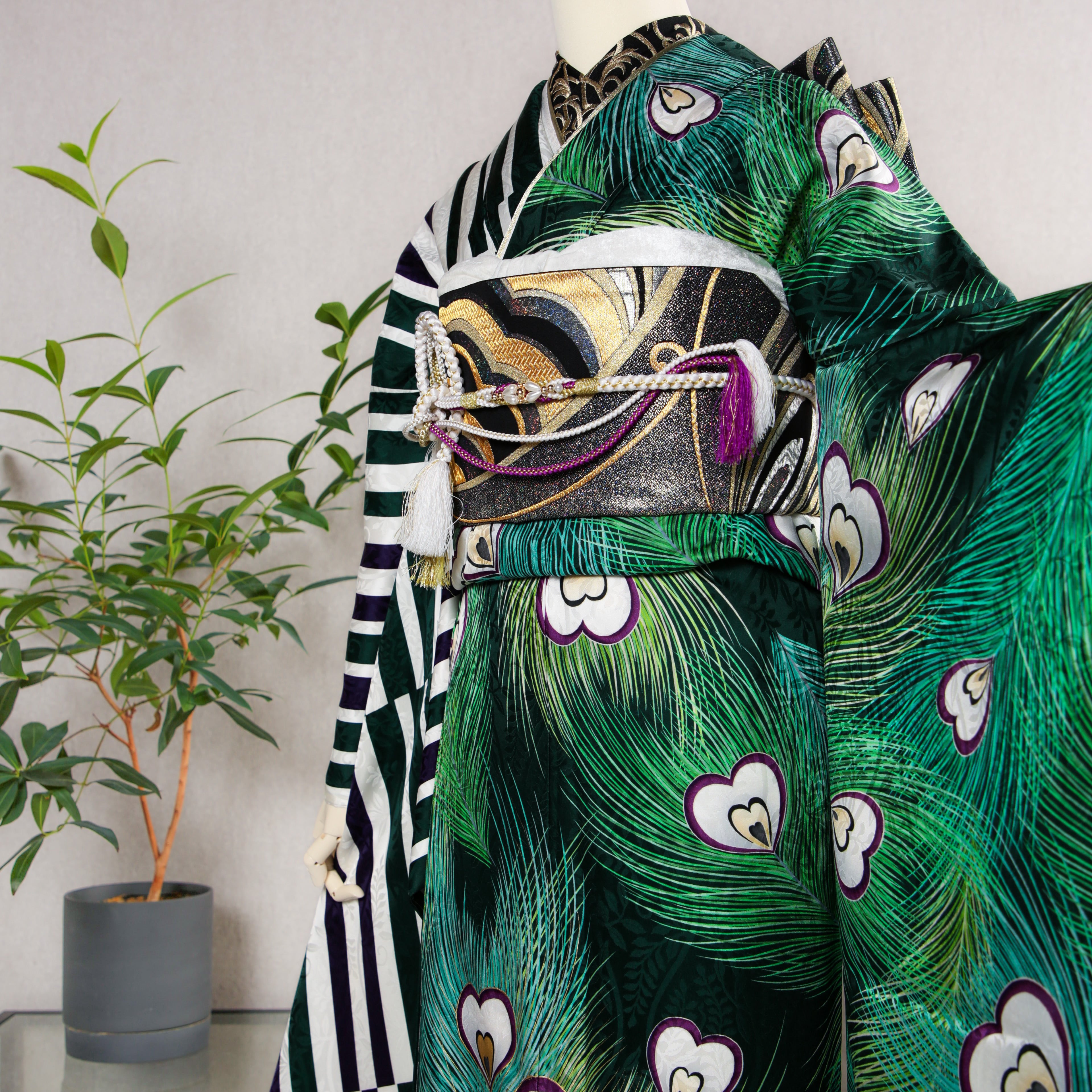 振袖フルセット 振袖セット 振袖 新品+USED品 LLサイズ クジャク×エメラルドグリーン 緑 紫 ストライプ 片身替わり ゴージャス 成人式 着物 晴れ着 7点フルセット FWRT-3