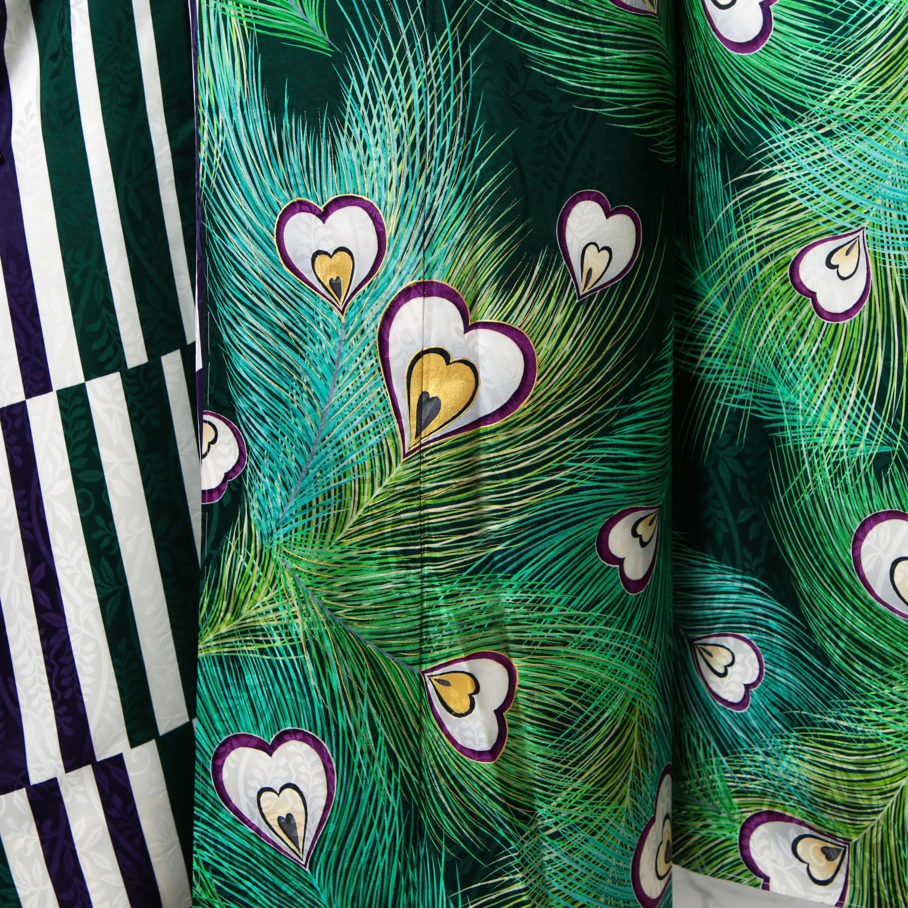 繊細な孔雀の羽根柄と、鮮やかなエメラルドグリーン×都会的なストライプのコントラストが新鮮な一着。