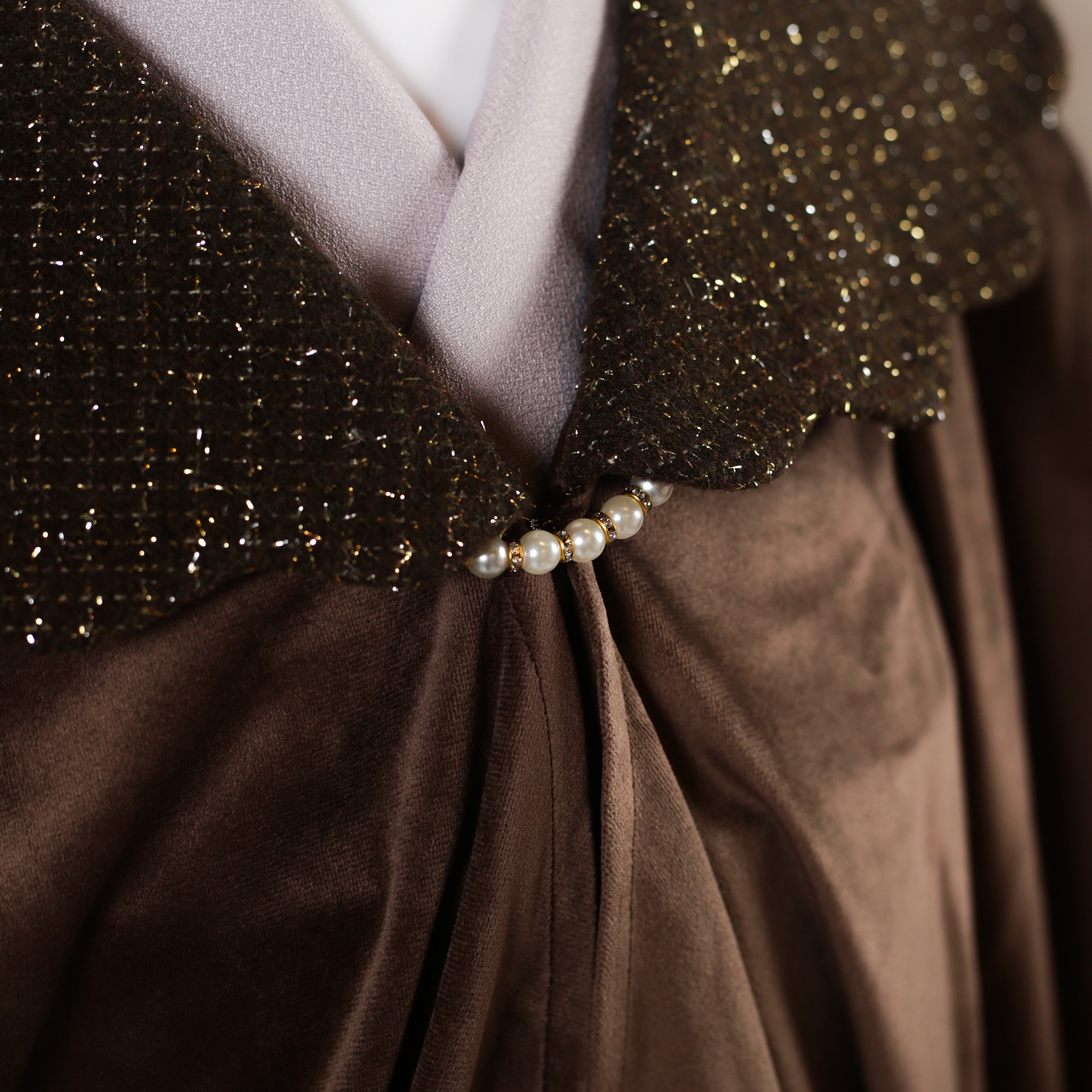 襟元のスカラップデザインと、きらめくパール・ラインストーンの留め具が、お顔周りを華やかに彩ります。